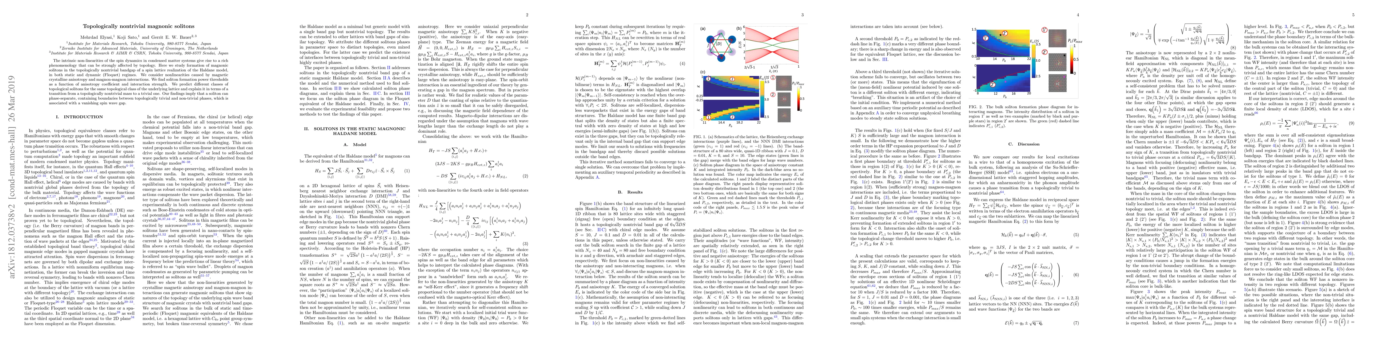 The intrinsic non-linearities of the spin dynamics in condensed matter systems give rise to a rich phenomenology that can be strongly affected by topology. Here we study formation of magnonic solitons in the topologically nontrivial bandgap of a spin lattice realization of the Haldane model, in both static and dynamic (Floquet) regimes. We consider nonlinearities caused by magnetic crystalline anisotropy and magnon-magnon interactions. We find soliton formation power thresholds as a function of anisotropy coefficient and interaction strength. We predict different classes of topological solitons for the same topological class of the underlying lattice and explain it in terms of a transition from a topologically nontrivial mass to a trivial one. Our findings imply that a soliton can phase-separate, containing boundaries between topologically trivial and non-trivial phases, which is associated with a vanishing spin wave gap.