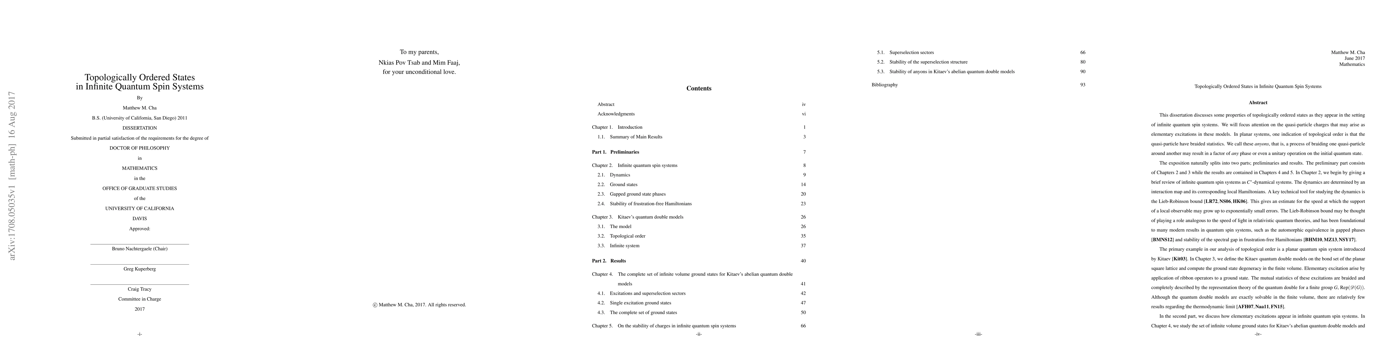 This dissertation discusses some properties of topologically ordered states as they appear in the setting of infinite quantum spin systems. We begin by studying the set of infinite volume ground states for Kitaev's abelian quantum double models. We show that states describing a single excitation in the bulk are infinite volume ground states, that is, local perturbations cannot remove the charge. The single excitations states, which are inequivalent for distinct charges, give a complete characterization of the sector theory for the set of ground states. Furthermore, any pure ground state is equivalent to some single excitation ground state. We proceed to study the stability of charges that are classified by certain representations of the algebra of observables. We introduce a new superselection criterion selecting almost localized and transportable $*$-endomorphisms with respect to a vacuum state. Equivalence classes of representations satisfying the superselection criterion form different charged superselection sectors of the system. We show that if the vacuum state satisfies certain locality conditions then the superselection structure will be a braided tensor $C^*$-category. Further, this superselection structure is stable up to deformations by a quasi-local dynamics. This result is then applied to show that the anyon structure of the abelian quantum double models is stable under local perturbations.