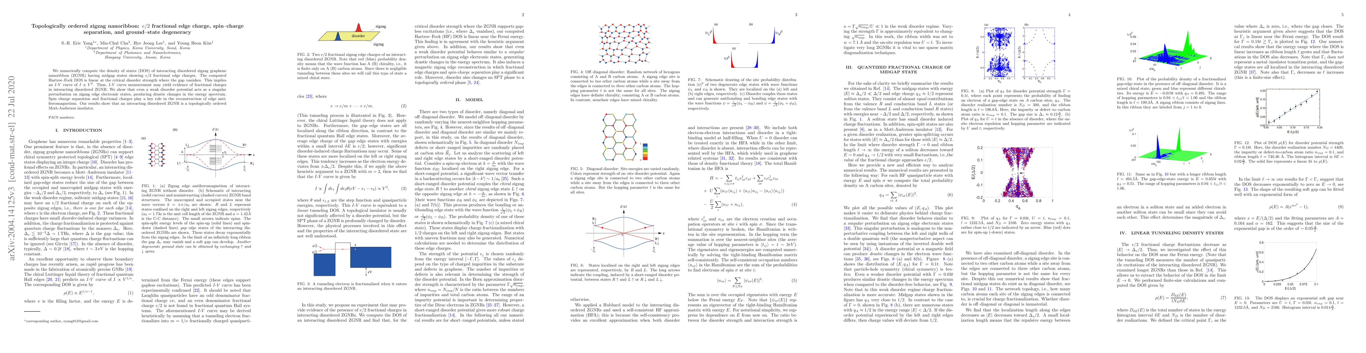 We numerically compute the density of states (DOS) of interacting disordered zigzag graphene nanoribbon (ZGNR) having midgap states showing $e/2$ fractional edge charges. The computed Hartree-Fock DOS is linear at the critical disorder strength where the gap vanishes. This implies an $I\mbox{-}V$ curve of $I\propto V^2$. Thus, $I\mbox{-}V$ curve measurement may yield evidence of fractional charges in interacting disordered ZGNR. We show that even a weak disorder potential acts as a singular perturbation on zigzag edge electronic states, producing drastic changes in the energy spectrum. Spin-charge separation and fractional charges play a key role in the reconstruction of edge antiferromagnetism. Our results show that an interacting disordered ZGNR is a topologically ordered Mott-Anderson insulator.