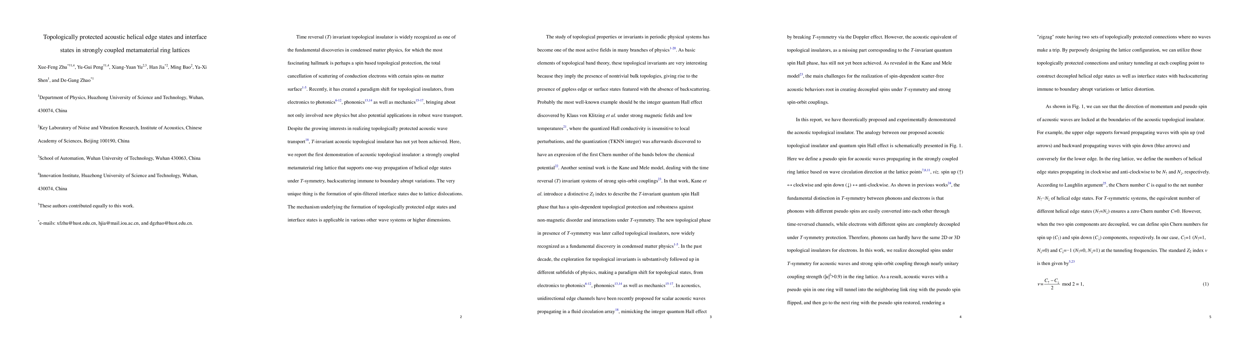 Time reversal (T) invariant topological insulator is widely recognized as one of the fundamental discoveries in condensed matter physics, for which the most fascinating hallmark is perhaps a spin based topological protection, the total cancellation of scattering of conduction electrons with certain spins on matter surface. Recently, it has created a paradigm shift for topological insulators, from electronics to photonics, phononics as well as mechanics, bringing about not only involved new physics but also potential applications in robust wave transport. Despite the growing interests in realizing topologically protected acoustic wave transport, T-invariant acoustic topological insulator has not yet been achieved. Here, we report the first demonstration of acoustic topological insulator: a strongly coupled metamaterial ring lattice that supports one-way propagation of helical edge states under T-symmetry, backscattering immune to boundary abrupt variations. The very unique thing is the formation of spin-filtered interface states due to lattice dislocations. The mechanism underlying the formation of topologically protected edge states and interface states is applicable in various other wave systems or higher dimensions.