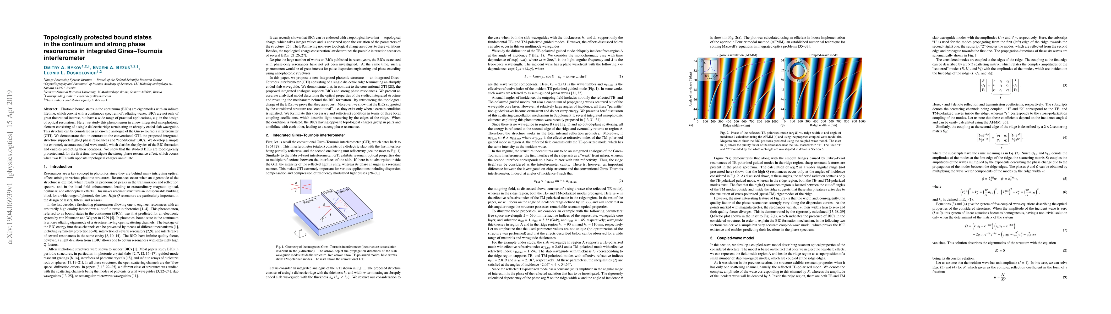 This paper investigates topologically protected bound states in the continuum (BICs) in an integrated Gires-Tournois interferometer (GTI) structure, demonstrating high-Q phase resonances and strong phase resonance effects due to the annihilation of BICs with opposite topological charges. The study employs a coupled-wave model to accurately predict BIC locations and their topological protection.