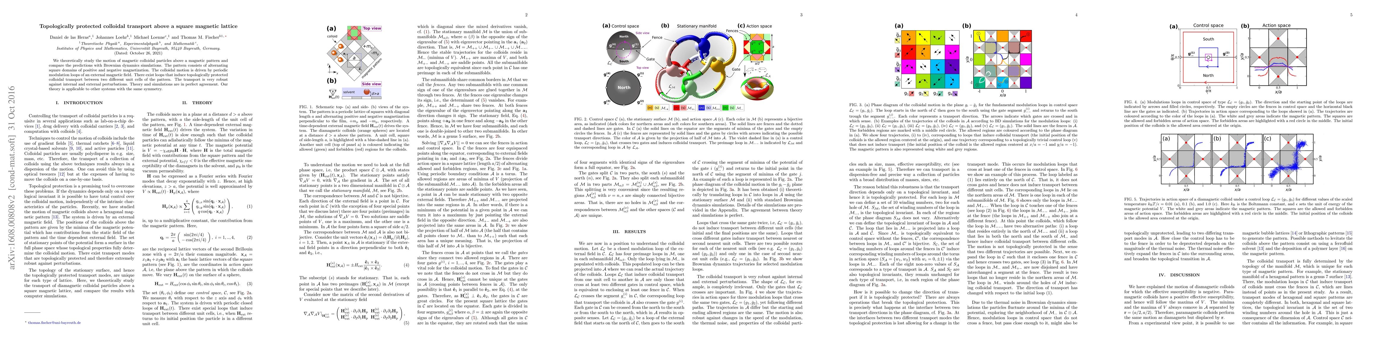 This paper explores the topologically protected transport of magnetic colloidal particles above a square magnetic lattice, demonstrating robust movement between unit cells driven by periodic magnetic field modulations, with theoretical predictions matching Brownian dynamics simulations.