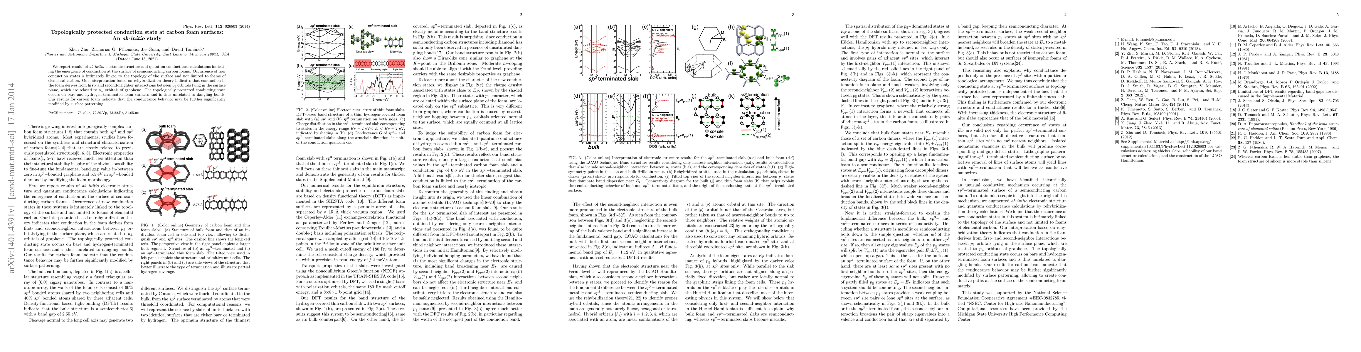 This paper presents \textit{ab initio} calculations showing the emergence of topologically protected conduction states on the surface of semiconducting carbon foams, linked to surface topology and $p_\|$ orbital interactions, independent of dangling bonds. The study suggests that surface patterning can significantly modify the conductance behavior.