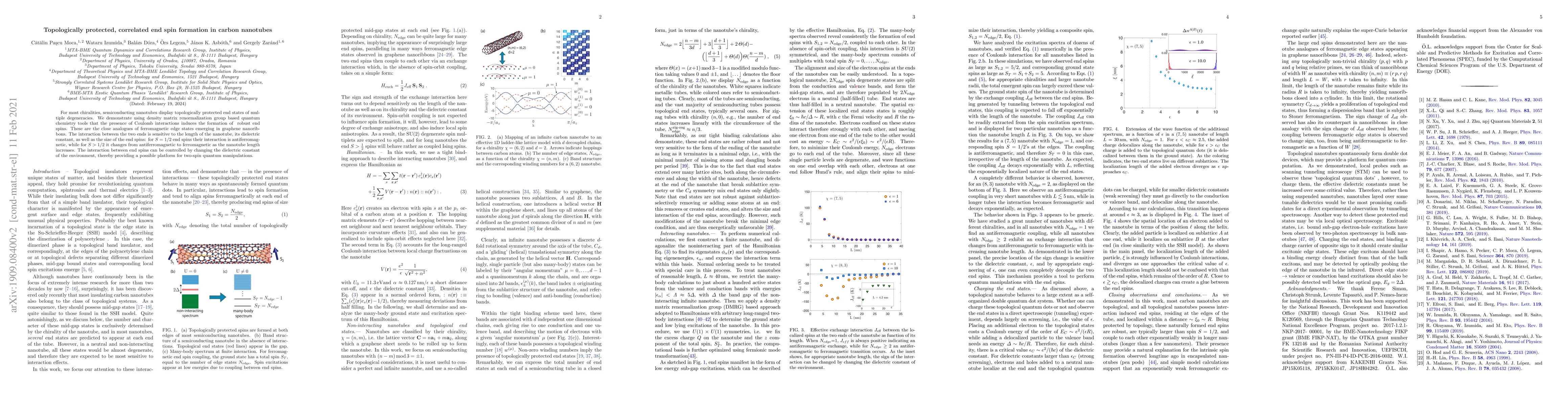 This paper demonstrates the formation of topologically protected end spins in semiconducting carbon nanotubes due to Coulomb interactions, analogous to ferromagnetic edge states in graphene nanoribbons. The interaction between these end spins can be tuned by altering the nanotube length and dielectric environment, offering potential for quantum manipulation.