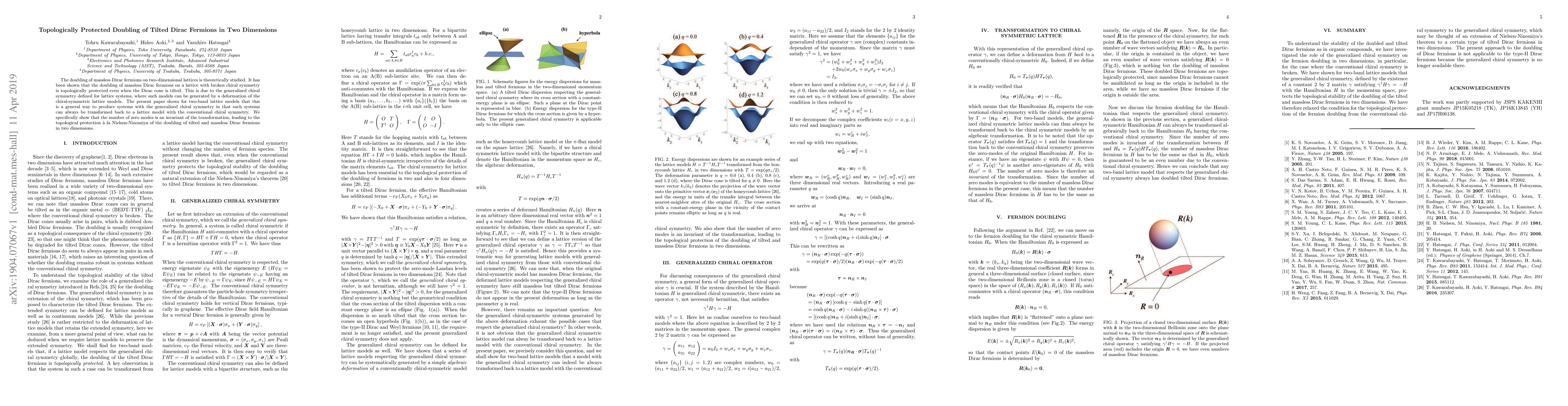 The paper investigates the topological protection of doubled massless Dirac fermions in two-dimensional lattices, demonstrating that this doubling is invariant under transformations, even when the Dirac cone is tilted, due to generalized chiral symmetry. This protection is maintained through the number of zero modes, consistent with the Nielsen-Ninomiya theorem.