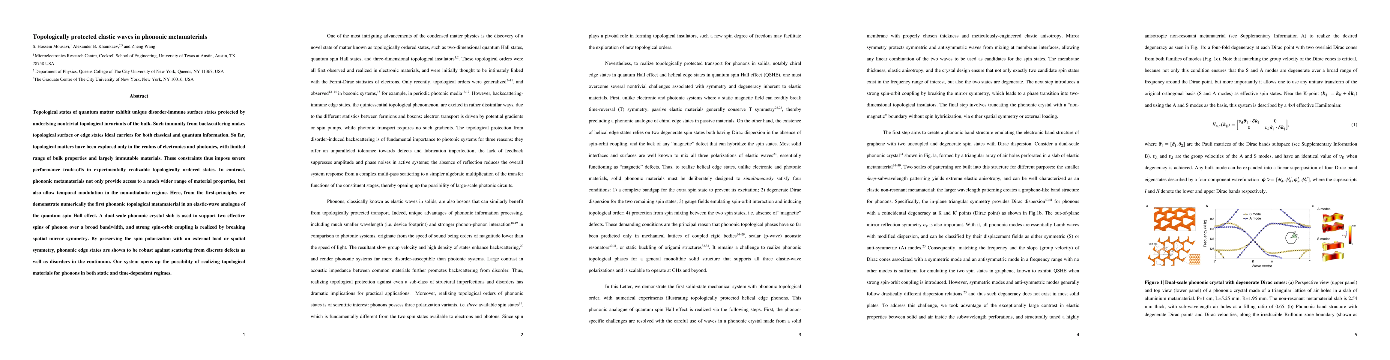 This paper demonstrates the first phononic topological metamaterial exhibiting elastic waves analogous to quantum spin Hall effects, showing immunity from scattering due to topological protection. The study highlights the potential for phononic materials to support a broader range of properties and temporal modulation, providing robust edge states against defects and disorders.