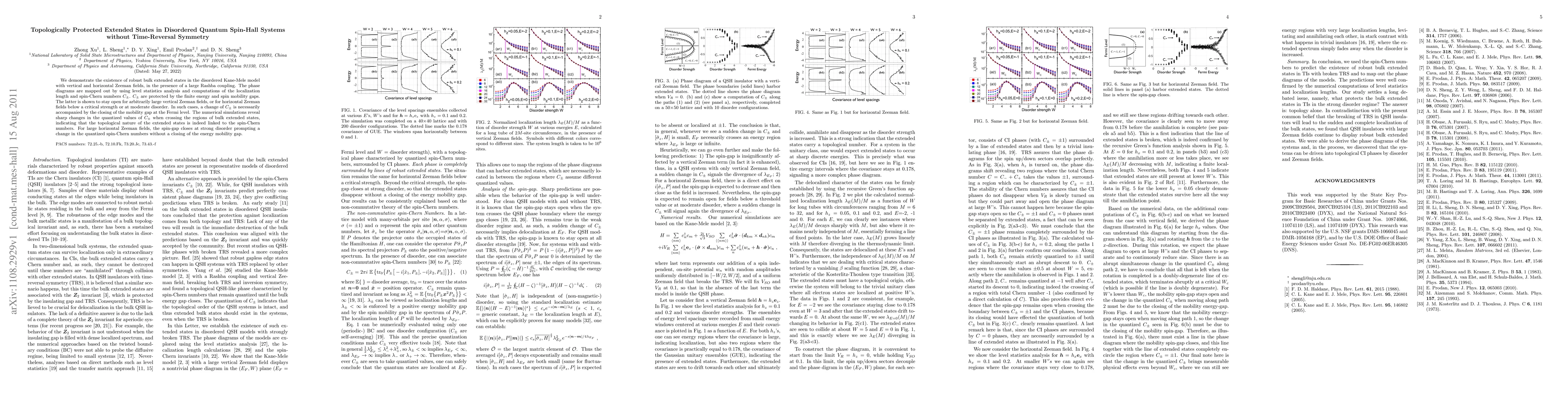 We demonstrate the existence of robust bulk extended states in the disordered Kane-Mele model with vertical and horizontal Zeeman fields, in the presence of a large Rashba coupling. The phase diagrams are mapped out by using level statistics analysis and computations of the localization length and spin-Chern numbers $C_\pm$. $C_\pm$ are protected by the finite energy and spin mobility gaps. The latter is shown to stay open for arbitrarily large vertical Zeeman fields, or for horizontal Zeeman fields below a critical strength or at moderate disorder. In such cases, a change of $C_\pm$ is necessarily accompanied by the closing of the mobility gap at the Fermi level. The numerical simulations reveal sharp changes in the quantized values of $C_\pm$ when crossing the regions of bulk extended states, indicating that the topological nature of the extended states is indeed linked to the spin-Chern numbers. For large horizontal Zeeman fields, the spin-gap closes at strong disorder prompting a change in the quantized spin-Chern numbers without a closing of the energy mobility gap.