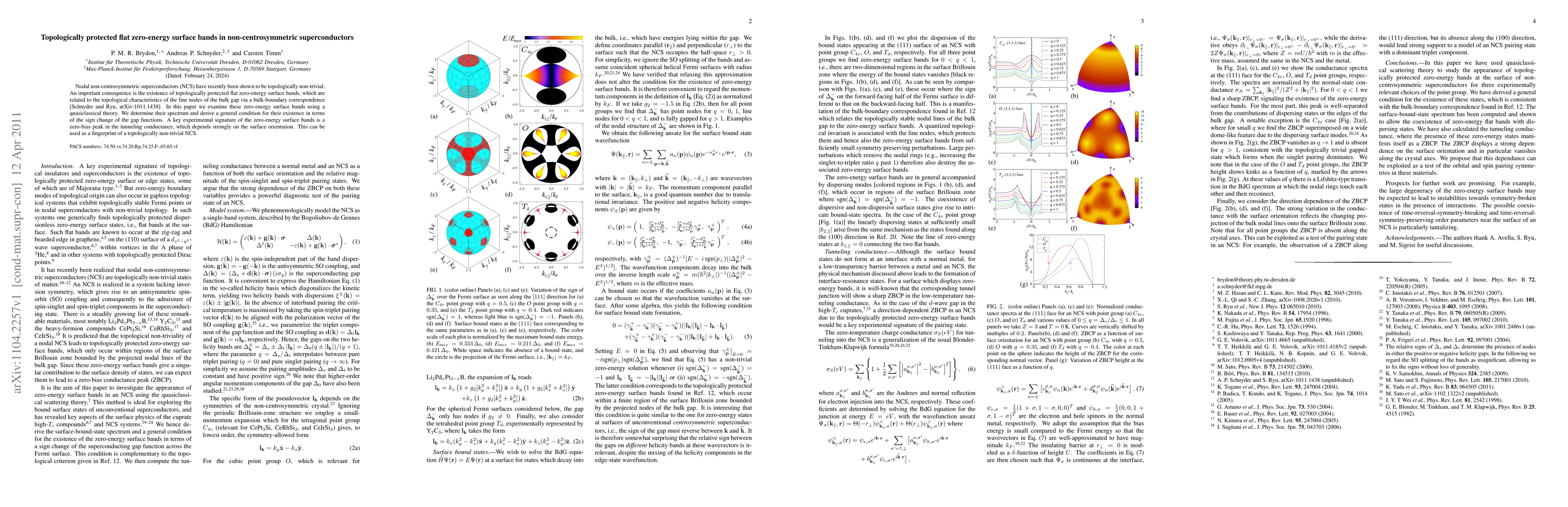 This paper investigates topologically protected flat zero-energy surface bands in nodal non-centrosymmetric superconductors, revealing their spectrum and conditions for existence. A notable experimental signature is a zero-bias peak in tunneling conductance, which can identify topologically non-trivial superconductors.
