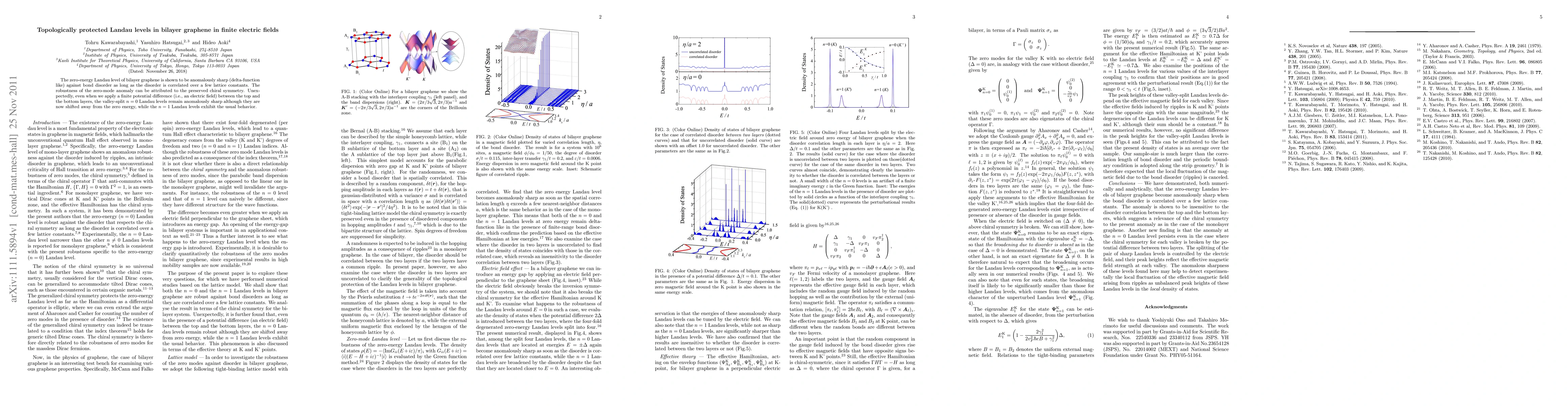 Summary: Bilayer graphene's zero-energy Landau level maintains exceptional sharpness against lattice disorder due to preserved chiral symmetry. Even under finite electric fields, the valley-split $n=0$ Landau levels stay anomalously sharp, unlike the $n=1$ levels which behave normally.