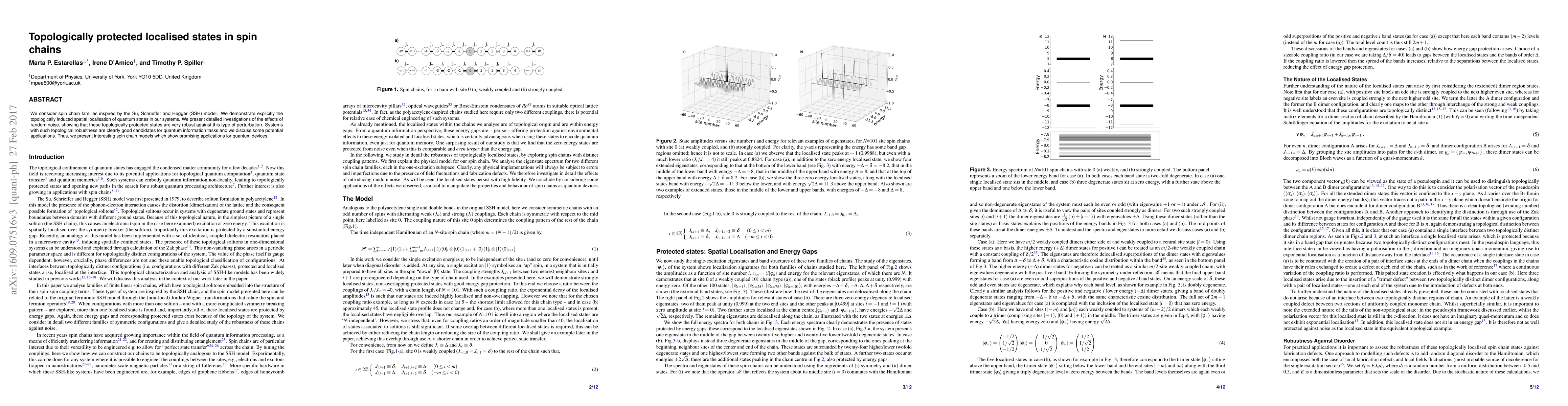 We consider spin chain families inspired by the Su, Schrieffer and Hegger (SSH) model. We demonstrate explicitly the topologically induced spatial localisation of quantum states in our systems. We present detailed investigations of the effects of random noise, showing that these topologically protected states are very robust against this type of perturbation. Systems with such topological robustness are clearly good candidates for quantum information tasks and we discuss some potential applications. Thus, we present interesting spin chain models which show promising applications for quantum devices.