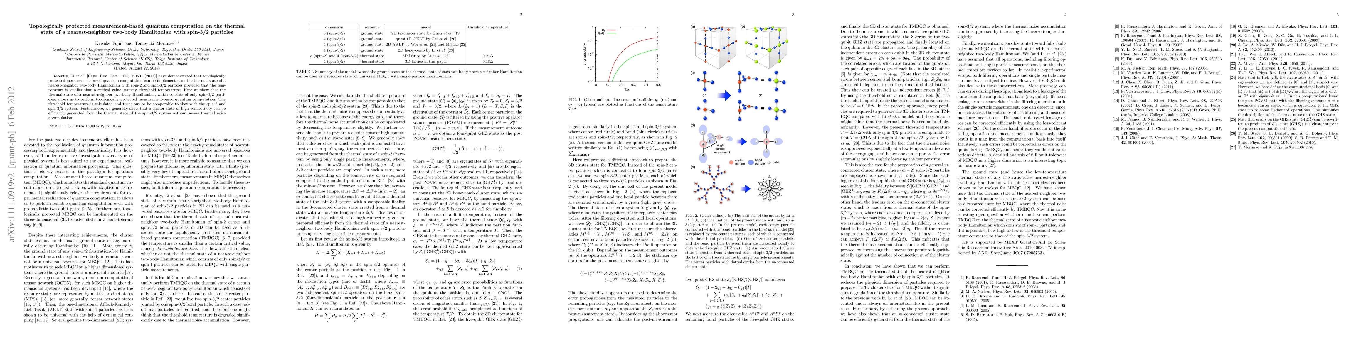This paper demonstrates that topologically protected measurement-based quantum computation can be achieved using the thermal state of a nearest-neighbor two-body Hamiltonian with spin-3/2 particles, provided the temperature is below a critical threshold. It also shows that a highly connected cluster state can be efficiently generated from this thermal state with minimal thermal noise.