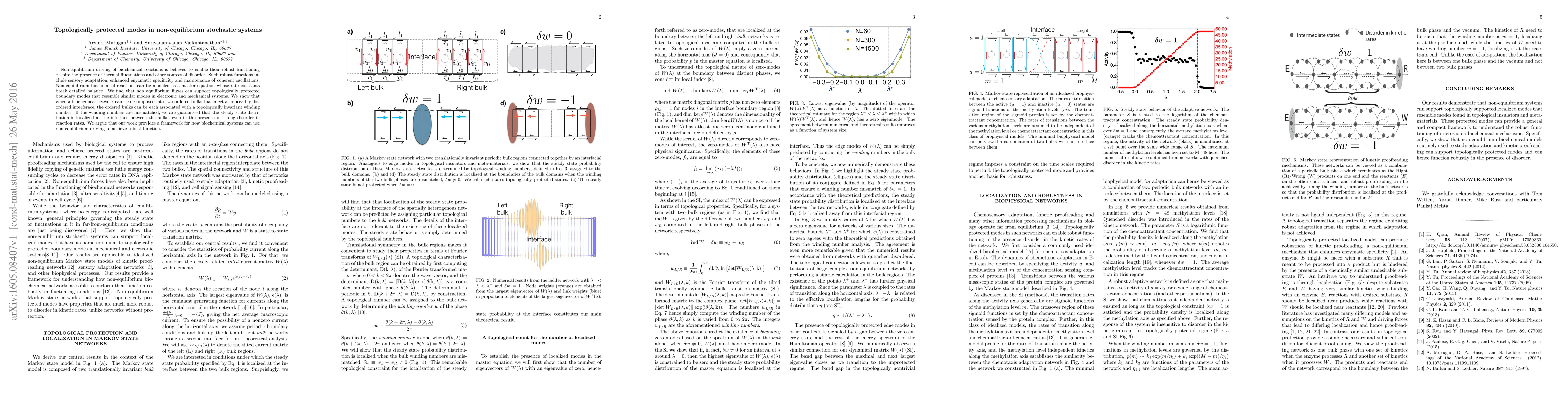 Non-equilibrium driving of biochemical reactions is believed to enable their robust functioning despite the presence of thermal fluctuations and other sources of disorder. Such robust functions include sensory adaptation, enhanced enyzmatic specificity and maintenance of coherent oscillations. Non-equilibrium biochemical reactions can be modeled as a master equation whose rate constants break detailed balance. We find that non equilibrium fluxes can support topologically protected boundary modes that resemble similar modes in electronic and mechanical systems. We show that when a biochemical network can be decomposed into two ordered bulks that meet at a possibly disordered interferace, the ordered bulks can be each associated with a topologically invariant winding number. If the winding numbers are mismatched, we are guaranteed that the steady state distribution is localized at the interface between the bulks, even in the presence of strong disorder in reaction rates. We argue that our work provides a framework for how biochemical systems can use non equilibrium driving to achieve robust function.