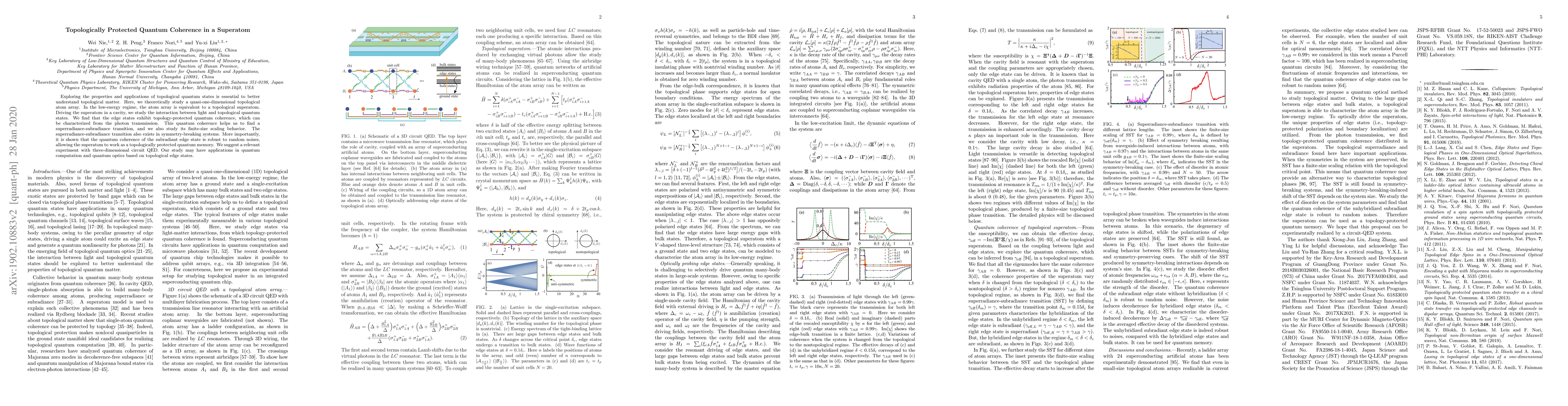 This paper investigates a quasi-one-dimensional topological atom array, termed a topological superatom, demonstrating topology-protected quantum coherence in its edge states. The study reveals a superradiance-subradiance transition and shows that the quantum coherence is robust against noise, suggesting potential applications in quantum memory and computation.