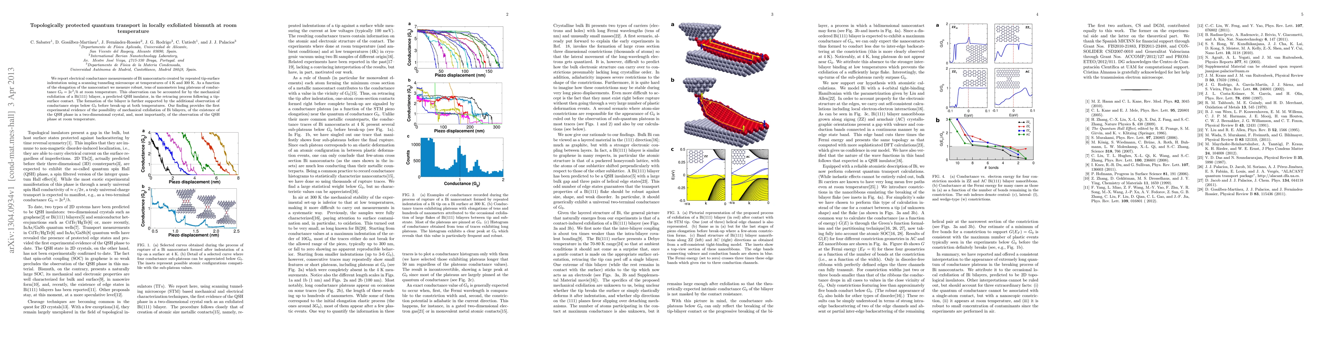 We report electrical conductance measurements of Bi nanocontacts created by repeated tip-surface indentation using a scanning tunneling microscope at temperatures of 4 K and 300 K. As a function of the elongation of the nanocontact we measure robust, tens of nanometers long plateaus of conductance G0 = 2e^2/h at room temperature. This observation can be accounted for by the mechanical exfoliation of a Bi(111) bilayer, a predicted QSH insulator, in the retracing process following a tip-surface contact. The formation of the bilayer is further supported by the additional observation of conductance steps below G0 before break-up at both temperatures. Our finding provides the first experimental evidence of the possibility of mechanical exfoliation of Bi bilayers, of the existence of the QSH phase in a two-dimensional crystal, and, most importantly, of the observation of the QSH phase at room temperature.