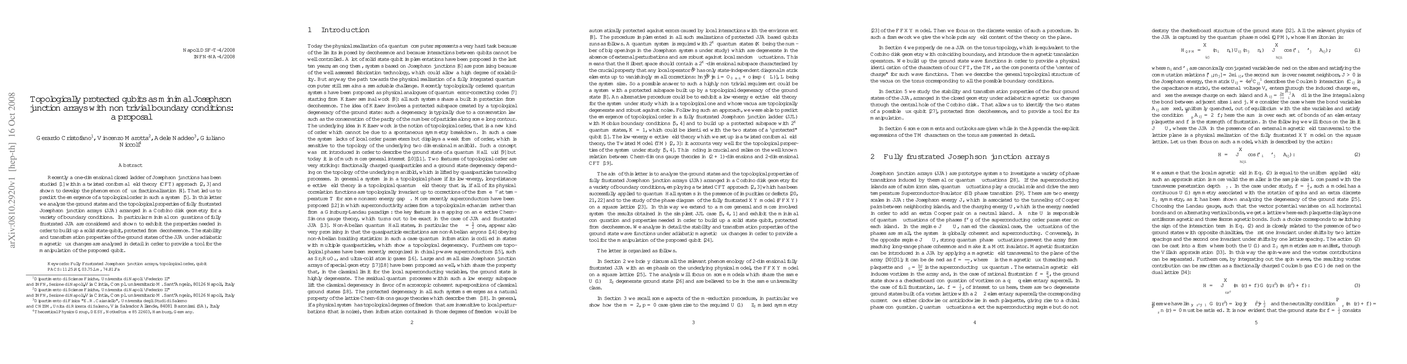 Recently a one-dimensional closed ladder of Josephson junctions has been studied (G. Cristofano et al., Phys. Lett. A 372 (2008) 2464) within a twisted conformal field theory (CFT) approach (G. Cristofano et al., Mod. Phys. Lett. A 15 (2000) 1679; Nucl. Phys. B 641 (2002) 547) and shown to develop the phenomenon of flux fractionalization (G. Cristofano et al., Eur. Phys. J. B 49 (2006) 83). That led us to predict the emergence of a topological order in such a system (G. Cristofano et al., JSTAT (2005) P03006). In this letter we analyze the ground states and the topological properties of fully frustrated Josephson junction arrays (JJA) arranged in a Corbino disk geometry for a variety of boundary conditions. In particular minimal configurations of fully frustrated JJA are considered and shown to exhibit the properties needed in order to build up a solid state qubit, protected from decoherence. The stability and transformation properties of the ground states of the JJA under adiabatic magnetic flux changes are analyzed in detail in order to provide a tool for the manipulation of the proposed qubit.