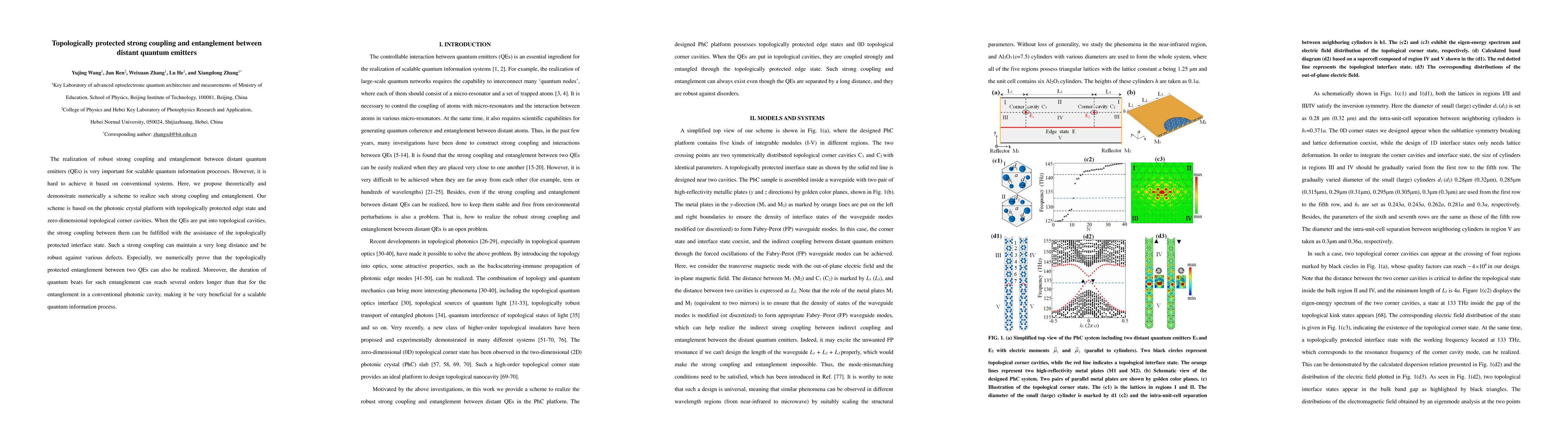 This paper proposes a theoretical scheme to achieve robust strong coupling and entanglement between distant quantum emitters using topological photonic crystal cavities, which leverages topologically protected edge states for long-distance and defect-resistant coupling. Numerical simulations confirm the feasibility of this approach, showing significantly enhanced entanglement duration compared to conventional systems.