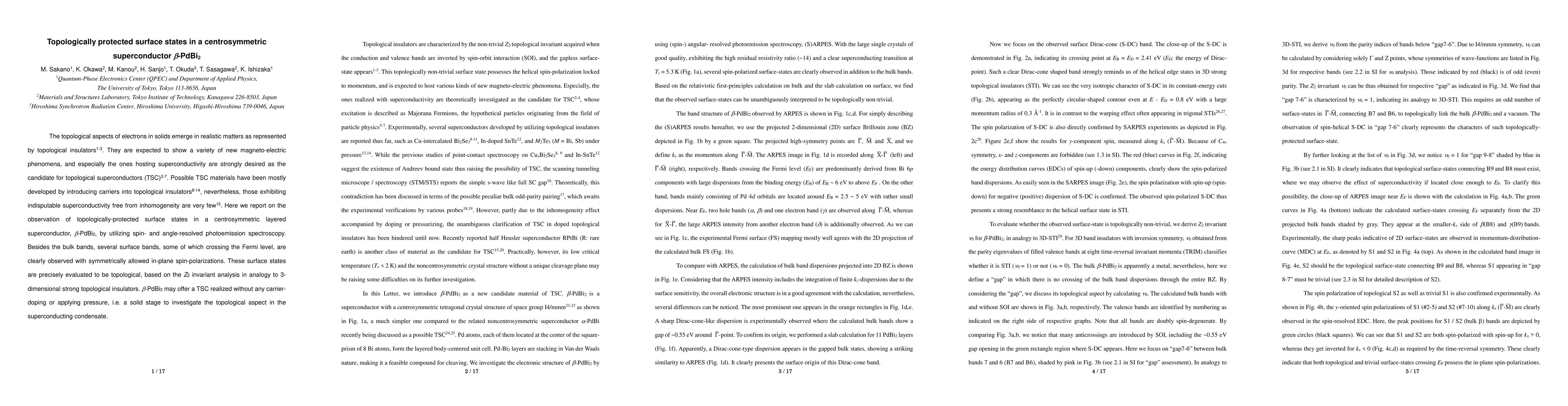 This paper reports the observation of topologically-protected surface states in the centrosymmetric superconductor beta-PdBi2 using spin- and angle-resolved photoemission spectroscopy. The findings suggest that beta-PdBi2 could be a topological superconductor realized without carrier doping or external pressure, offering a unique platform to study topological phenomena in superconductivity.