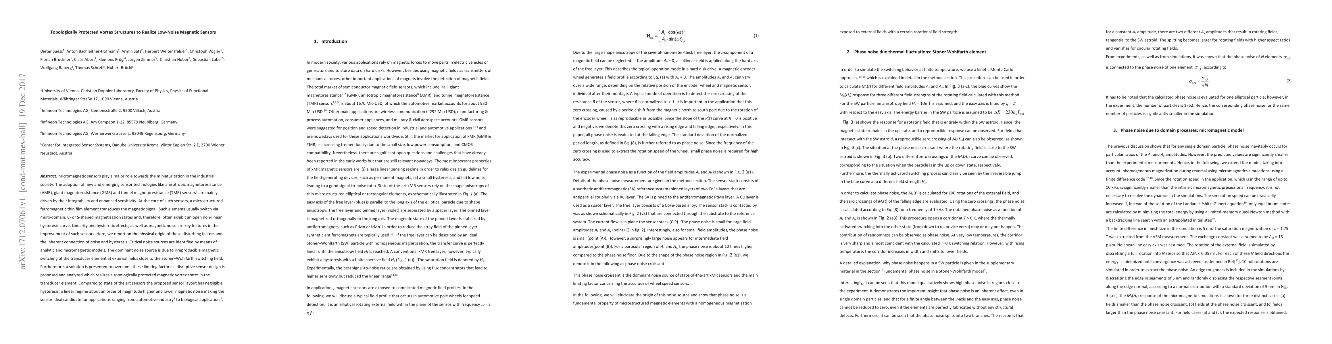 This paper investigates the sources of magnetic noise and hysteresis in micromagnetic sensors, identifying irreproducible magnetic switching near the Stoner Wohlfarth switching field as a critical noise source. It proposes a novel sensor design utilizing topologically protected magnetic vortex structures to achieve negligible hysteresis, significantly higher linearity, and lower magnetic noise, thereby enhancing sensor performance for various applications.