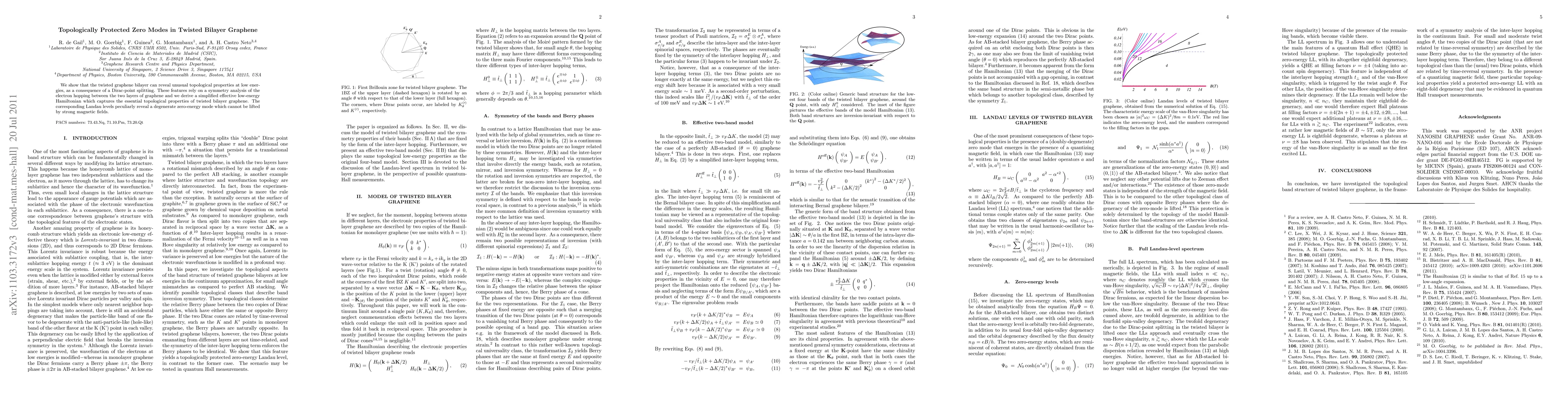 This research demonstrates that twisted bilayer graphene exhibits unique topological properties at low energies due to Dirac-point splitting, leading to a protected zero-energy mode in Landau levels that remains unaffected by strong magnetic fields. The study employs symmetry analysis and an effective low-energy Hamiltonian to elucidate these features.