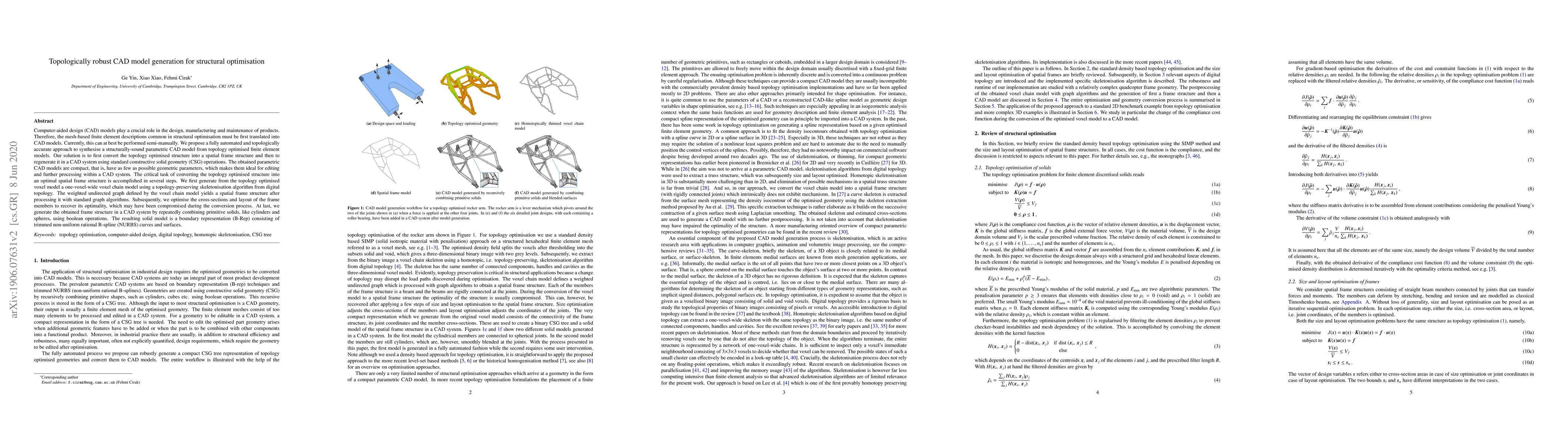 This paper proposes a fully automated method for generating topologically robust CAD models from topology optimised finite element structures. The approach involves converting the optimised structure into a spatial frame and regenerating it using constructive solid geometry operations, ensuring minimal geometric parameters for ease of editing.