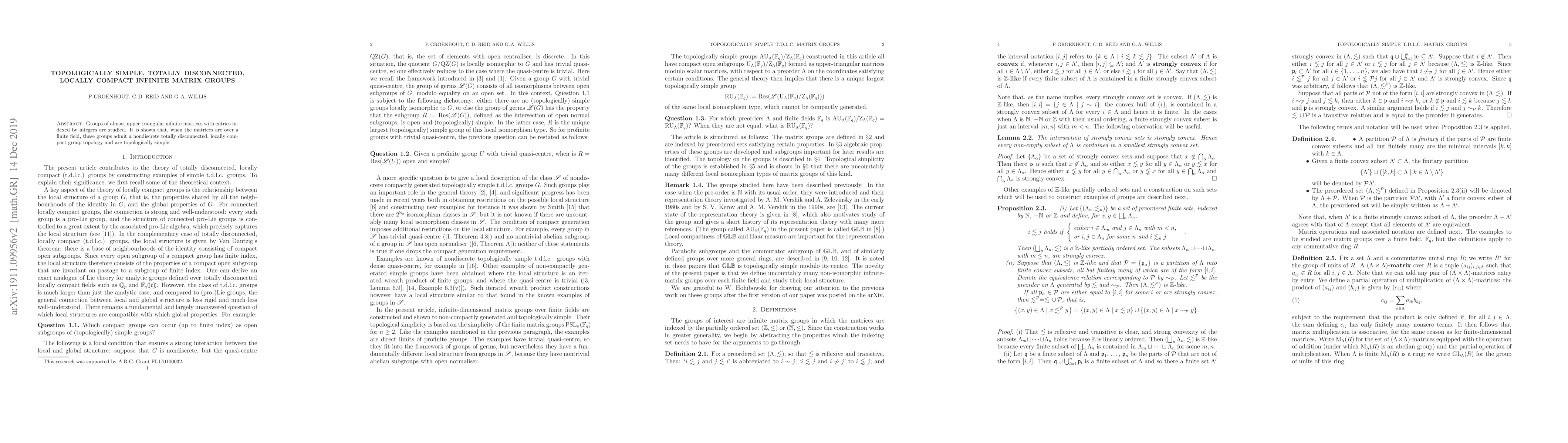 Summary: This paper explores groups of almost upper triangular infinite matrices over finite fields, demonstrating they possess a nondiscrete, totally disconnected, locally compact topology and are topologically simple.