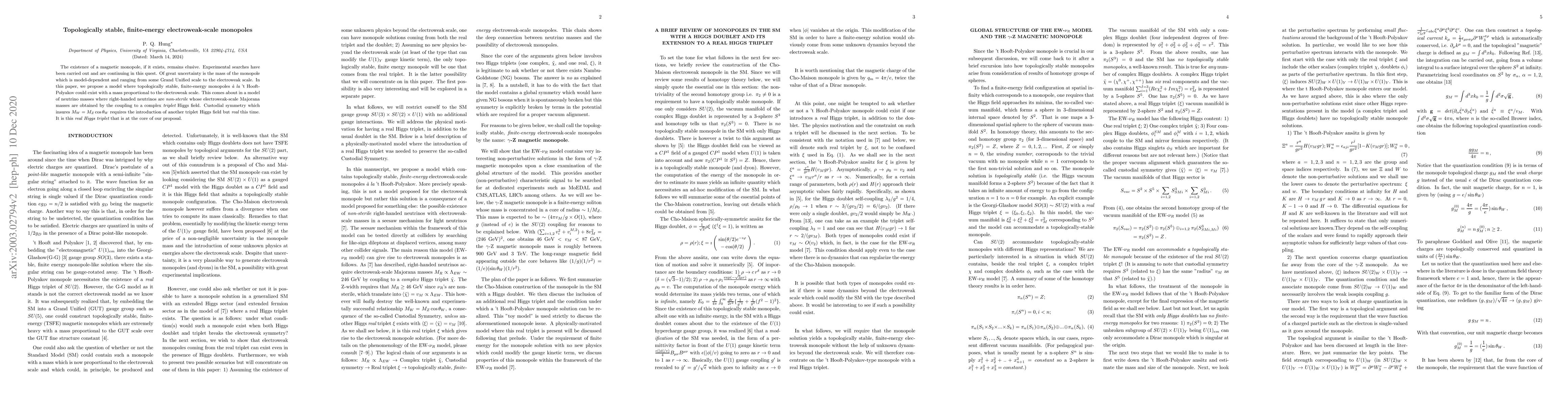 The research proposes a model where topologically stable, finite-energy monopoles can exist with a mass proportional to the electroweak scale. This is achieved by introducing a real Higgs triplet that couples to right-handed neutrinos with electroweak-scale Majorana masses, ensuring Custodial Symmetry.