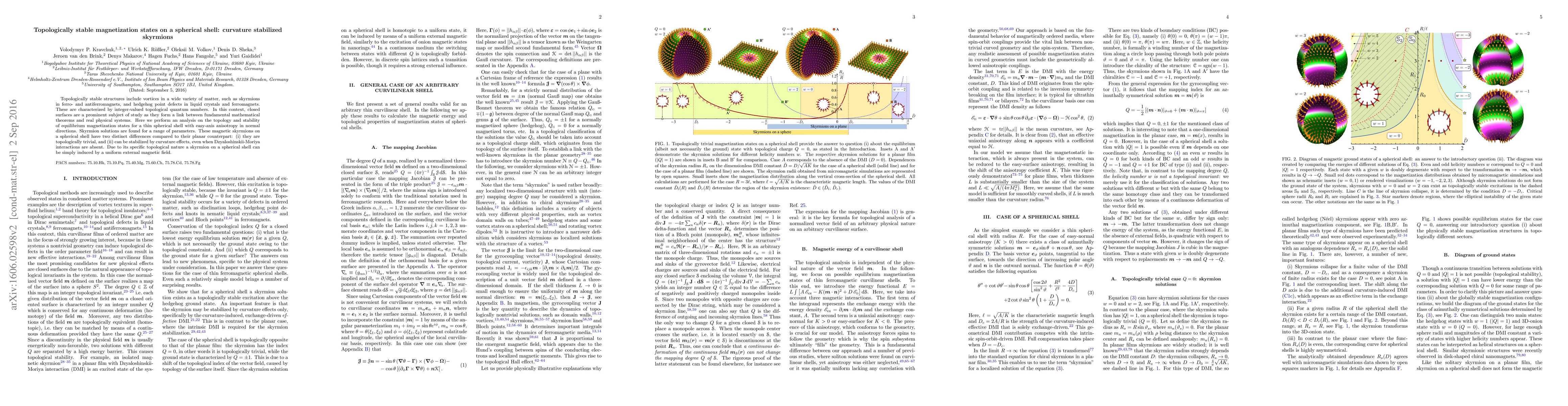 This paper investigates the topological stability of magnetization states on a spherical shell, discovering that skyrmions can be stabilized by curvature effects without Dzyaloshinskii-Moriya interactions, contrasting with their planar counterparts. These curvature-stabilized skyrmions can be induced by a uniform external magnetic field.