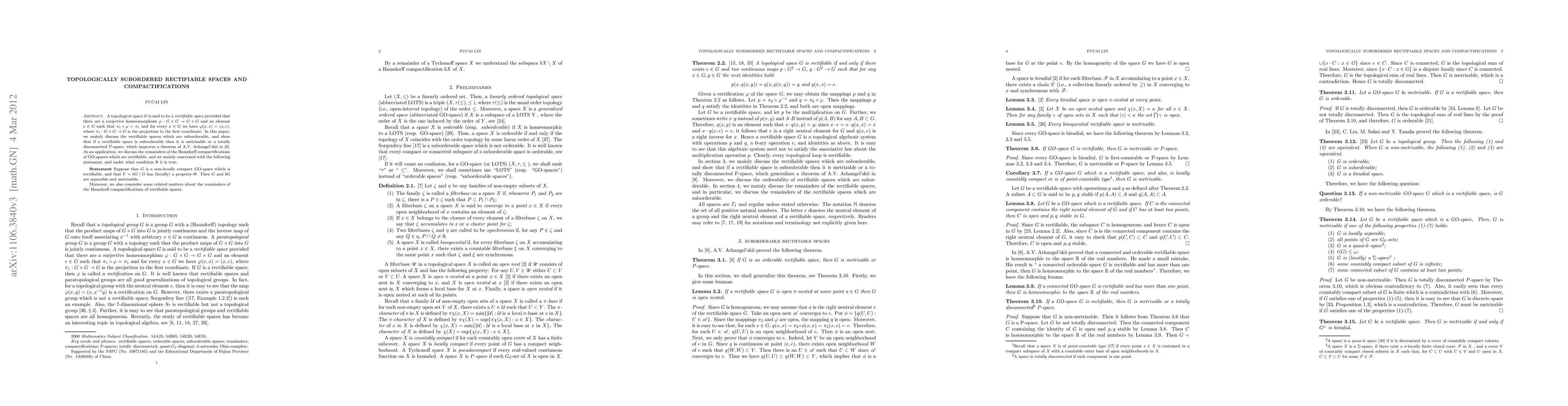 A topological space $G$ is said to be a {\it rectifiable space} provided that there are a surjective homeomorphism $\phi :G\times G\rightarrow G\times G$ and an element $e\in G$ such that $\pi_{1}\circ \phi =\pi_{1}$ and for every $x\in G$ we have $\phi (x, x)=(x, e)$, where $\pi_{1}: G\times G\rightarrow G$ is the projection to the first coordinate. In this paper, we mainly discuss the rectifiable spaces which are suborderable, and show that if a rectifiable space is suborderable then it is metrizable or a totally disconnected P-space, which improves a theorem of A.V. Arhangel'ski\v\i\ in \cite{A20092}. As an applications, we discuss the remainders of the Hausdorff compactifications of GO-spaces which are rectifiable, and we mainly concerned with the following statement, and under what condition $\Phi$ it is true. Statement: Suppose that $G$ is a non-locally compact GO-space which is rectifiable, and that $Y=bG\setminus G$ has (locally) a property-$\Phi$. Then $G$ and $bG$ are separable and metrizable. Moreover, we also consieder some related matters about the remainders of the Hausdorff compactifications of rectifiable spaces.