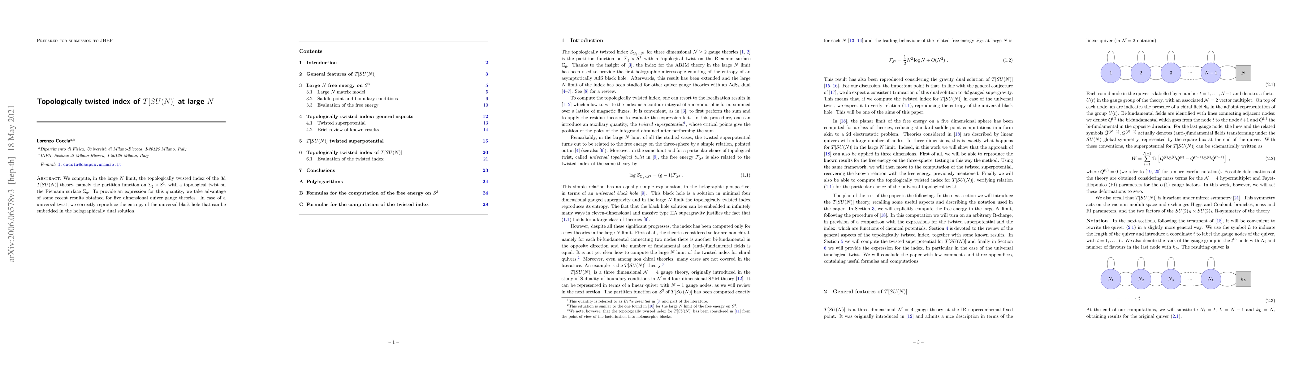 The paper calculates the topologically twisted index for the 3d $T[SU(N)]$ theory at large N using insights from five-dimensional quiver gauge theories. It accurately reproduces the entropy of a universal black hole in a holographic dual solution.
