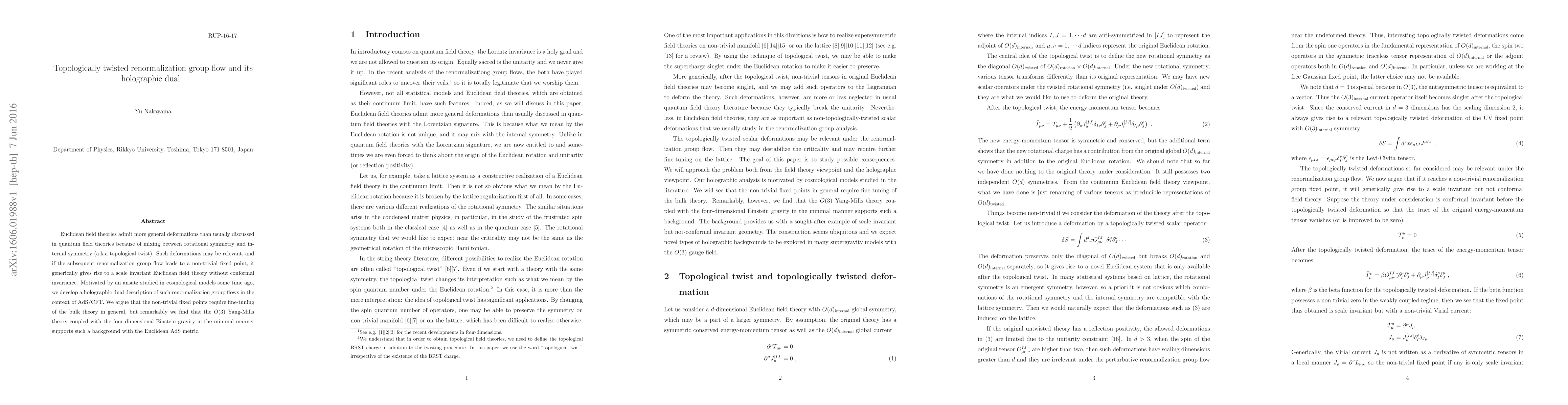 Euclidean field theories admit more general deformations than usually discussed in quantum field theories because of mixing between rotational symmetry and internal symmetry (a.k.a topological twist). Such deformations may be relevant, and if the subsequent renormalization group flow leads to a non-trivial fixed point, it generically gives rise to a scale invariant Euclidean field theory without conformal invariance. Motivated by an ansatz studied in cosmological models some time ago, we develop a holographic dual description of such renormalization group flows in the context of AdS/CFT. We argue that the non-trivial fixed points require fine-tuning of the bulk theory in general, but remarkably we find that the $O(3)$ Yang-Mills theory coupled with the four-dimensional Einstein gravity in the minimal manner supports such a background with the Euclidean AdS metric.