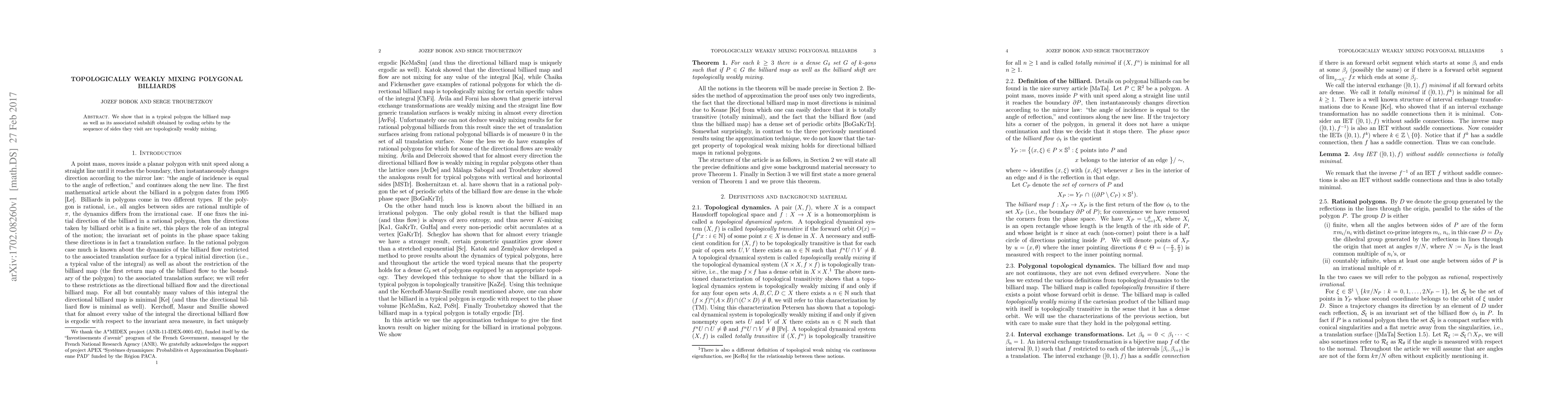 Summary: The study demonstrates that the billiard map in a typical polygon and its associated subshift, which records the sequence of sides visited by orbits, are both topologically weakly mixing. This indicates a strong form of mixing behavior in these systems.