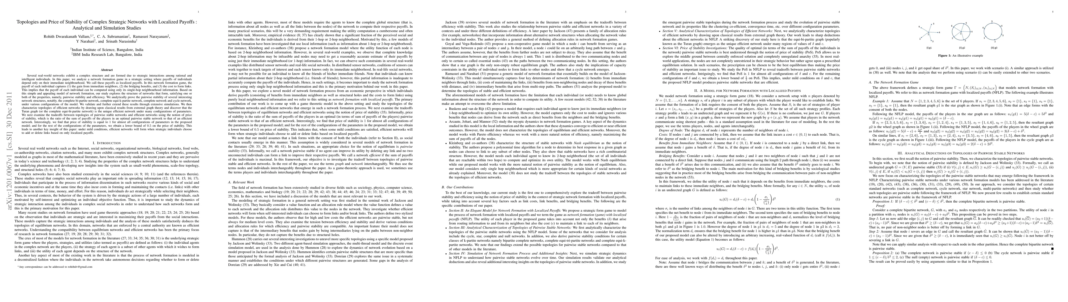 We analyze a network formation game in a strategic setting where payoffs of individuals depend only on their immediate neighbourhood. We call these payoffs as localized payoffs. In this game, the payoff of each individual captures (1) the gain from immediate neighbors, (2) the bridging benefits, and (3) the cost to form links. This implies that the payoff of each individual can be computed using only its single-hop neighbourhood information. Based on this simple model of network formation, our study explores the structure of networks that form, satisfying one or both of the properties, namely, pairwise stability and efficiency. We analytically prove the pairwise stability of several interesting network structures, notably, the complete bi-partite network, complete equi-k-partite network, complete network and cycle network, under various configurations of the model. We validate and extend these results through extensive simulations. We characterize topologies of efficient networks by drawing upon classical results from extremal graph theory and discover that the Turan graph (or the complete equi-bi-partite network) is the unique efficient network under many configurations of parameters. We examine the tradeoffs between topologies of pairwise stable networks and efficient networks using the notion of price of stability, which is the ratio of the sum of payoffs of the players in an optimal pairwise stable network to that of an efficient network. Interestingly, we find that price of stability is equal to 1 for almost all configurations of parameters in the proposed model; and for the rest of the configurations of the parameters, we obtain a lower bound of 0.5 on the price of stability. This leads to another key insight of this paper: under mild conditions, efficient networks will form when strategic individuals choose to add or delete links based on only localized payoffs.