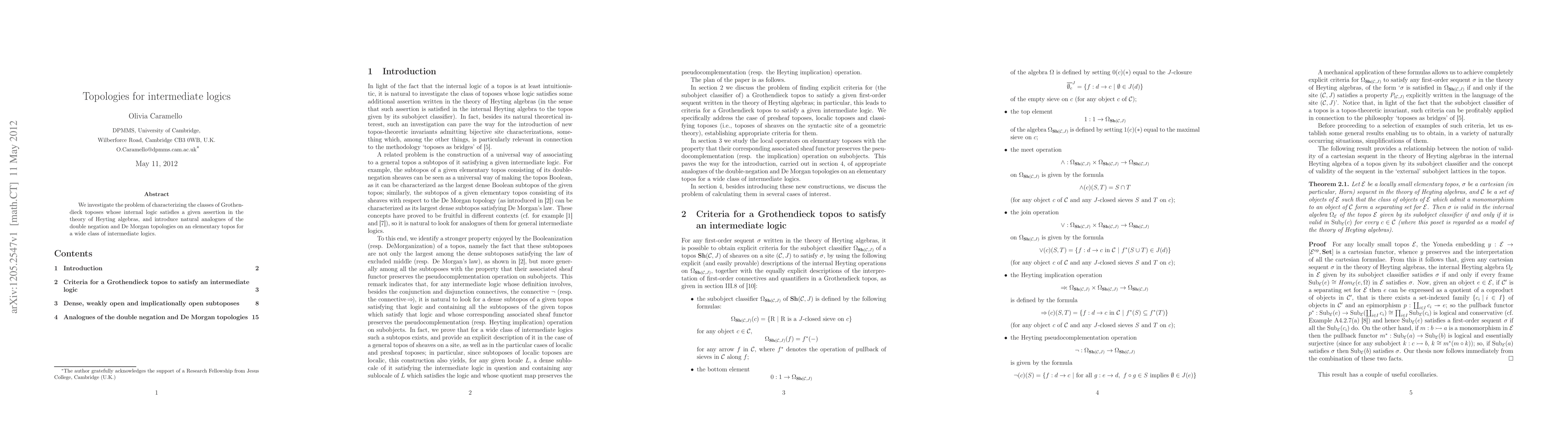 Their work provides a framework for characterizing the classes of intermediate logics and establishes natural analogues of well-known topologies.