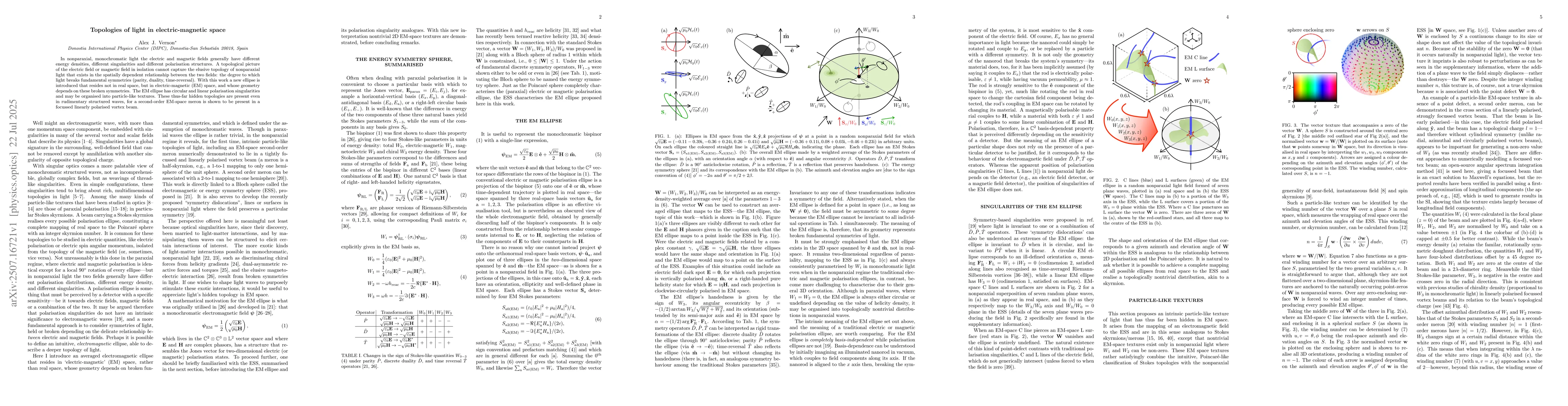 In nonparaxial, monochromatic light the electric and magnetic fields generally have different energy densities, different singularities and different polarisation structures. A topological picture of the electric field or magnetic field in isolation cannot capture the elusive topology of nonparaxial light that exists in the spatially dependent relationship between the two fields: the degree to which light breaks fundamental symmetries (parity, duality, time-reversal). With this work a new ellipse is introduced that resides not in real space, but in electric-magnetic (EM) space, and whose geometry depends on these broken symmetries. The EM ellipse has circular and linear polarisation singularities and may be organised into particle-like textures. These thus-far hidden topologies are present even in rudimentary structured waves, for a second-order EM-space meron is shown to be present in a focussed linearly polarised vortex beam.