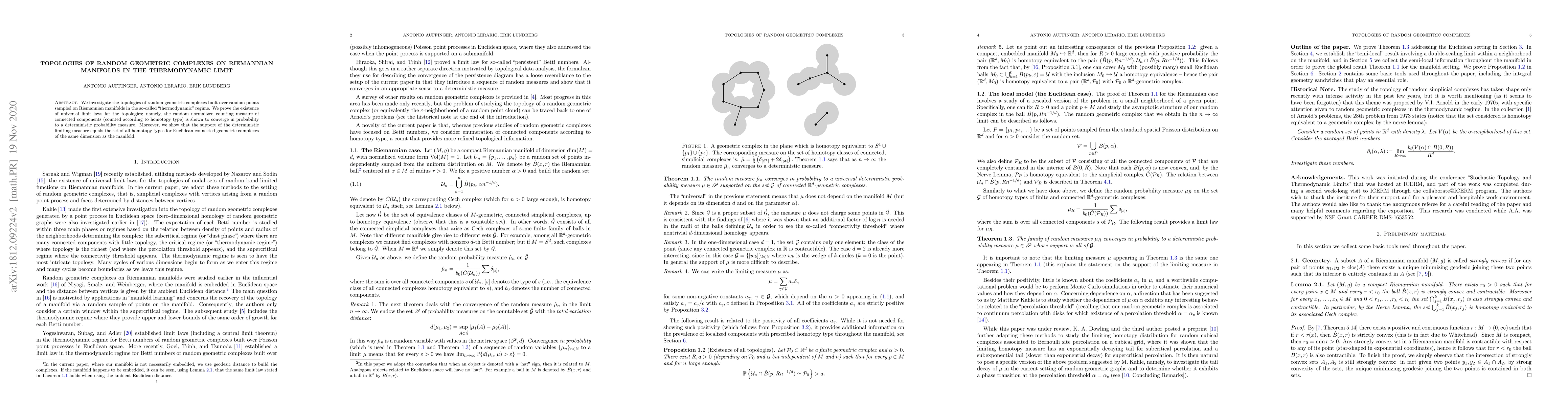 This paper studies the topological properties of random geometric complexes on Riemannian manifolds in the thermodynamic limit, proving the existence of universal limit laws for their normalized counting measures of connected components. The convergence in probability to a deterministic probability measure is demonstrated, with the support of this limit matching the homotopy types of Euclidean geometric complexes of the same dimension.