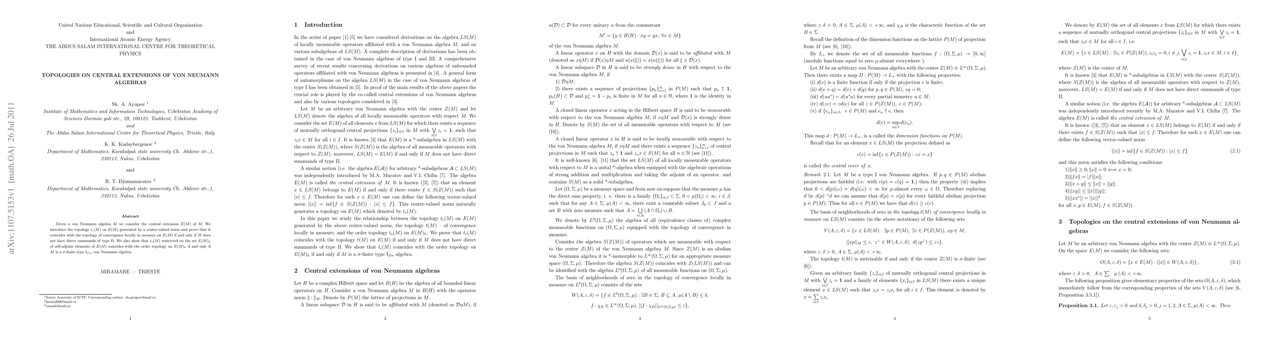 The paper introduces a topology on central extensions of von Neumann algebras that coincides with convergence in measure if $M$ has no direct summands of type II, and with order topology for self-adjoint elements under certain conditions.