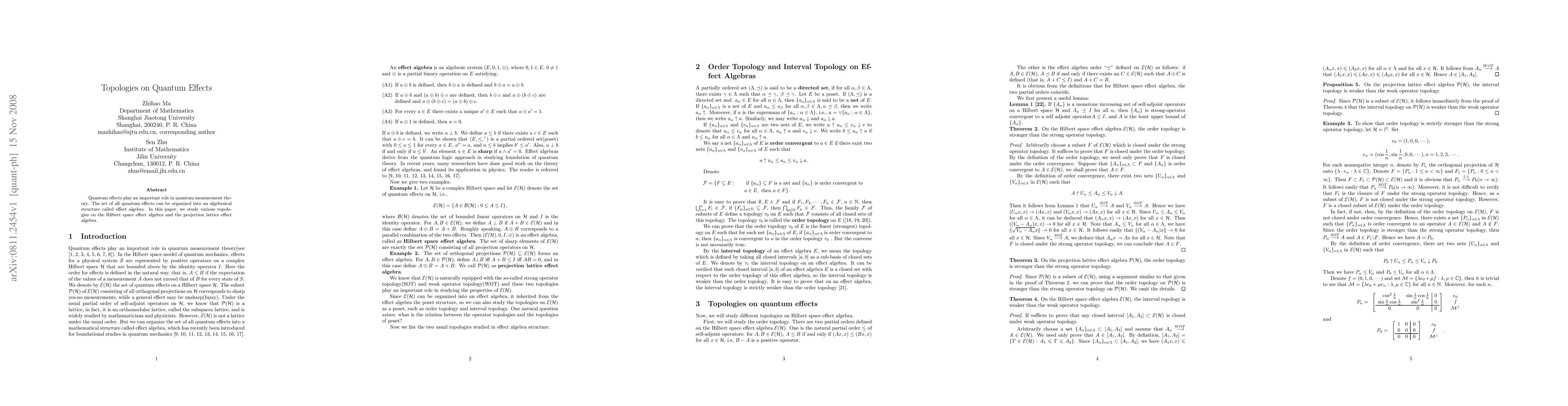 Quantum effects play an important role in quantum measurement theory. The set of all quantum effects can be organized into an algebraical structure called effect algebra. In this paper, we study various topologies on the Hilbert space effect algebra and the projection lattice effect algebra.
