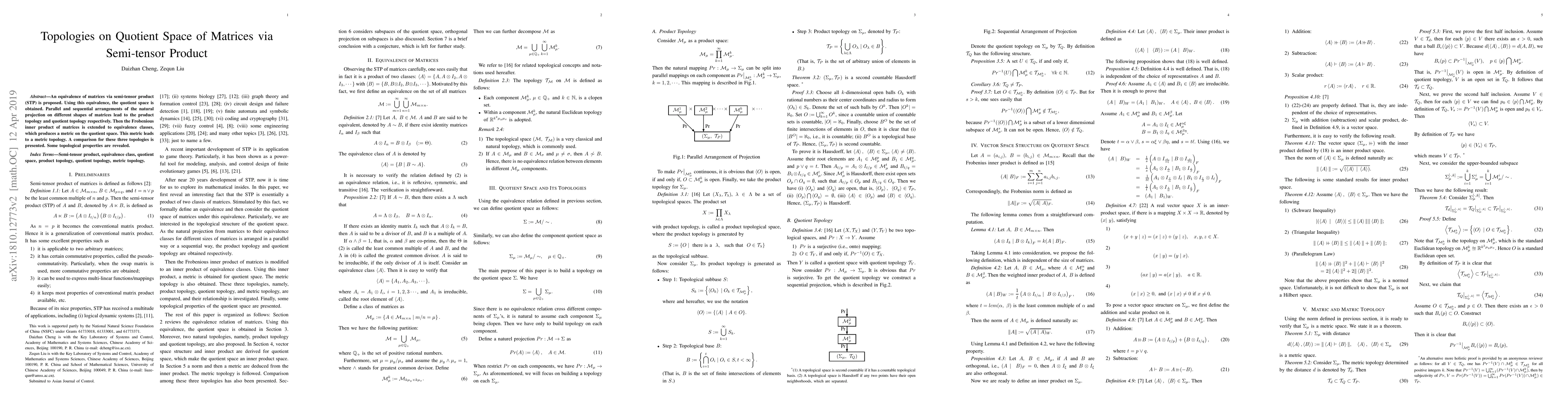 This paper proposes an equivalence of matrices via semi-tensor product (STP) to obtain a quotient space, comparing product and quotient topologies. It extends the Frobenius inner product to equivalence classes, establishing a metric topology and analyzing its properties.
