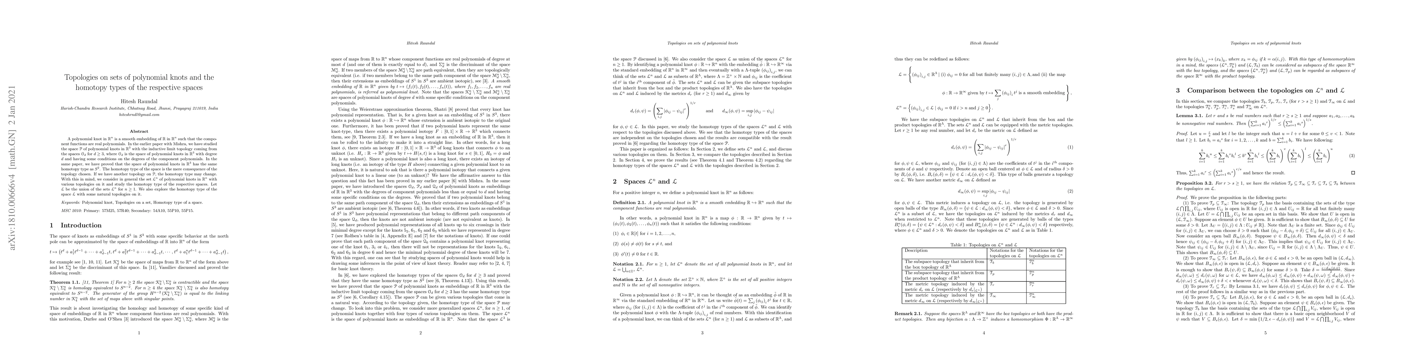 This paper examines various topologies on sets of polynomial knots in $\mathbb{R}^n$ and investigates how these topologies affect the homotopy types of the respective spaces. It extends prior findings on $\mathcal{P}$ in $\mathbb{R}^3$ to a broader context and explores the union $\mathcal{L}$ of such sets with different topologies.