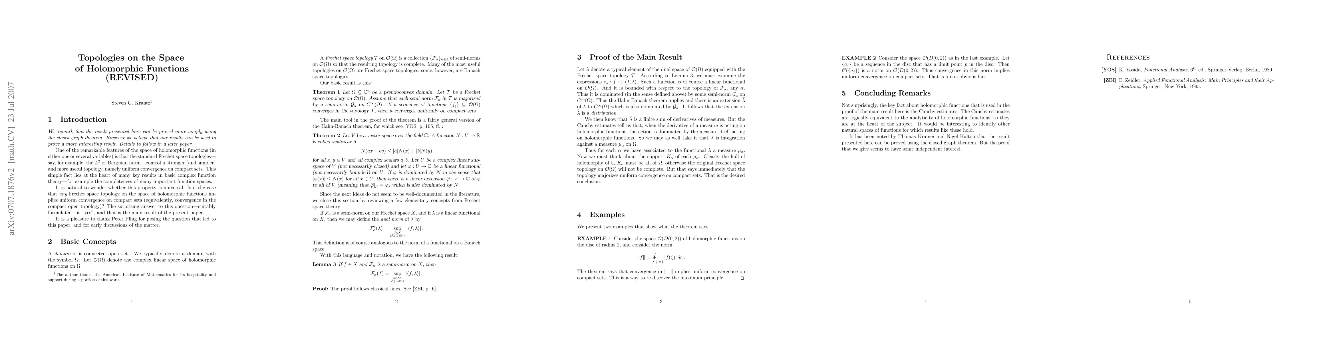 We show that a fairly arbitrary Frechet space topology on the space of holomorphic functions on a domain controls the topology of uniform convergence on compact sets. In fact it turns out that the result we present can be proved more simply using the closed graph theorem. However, we believe that the techniques presented here may be used to prove a more interesting result. Details to appear later.