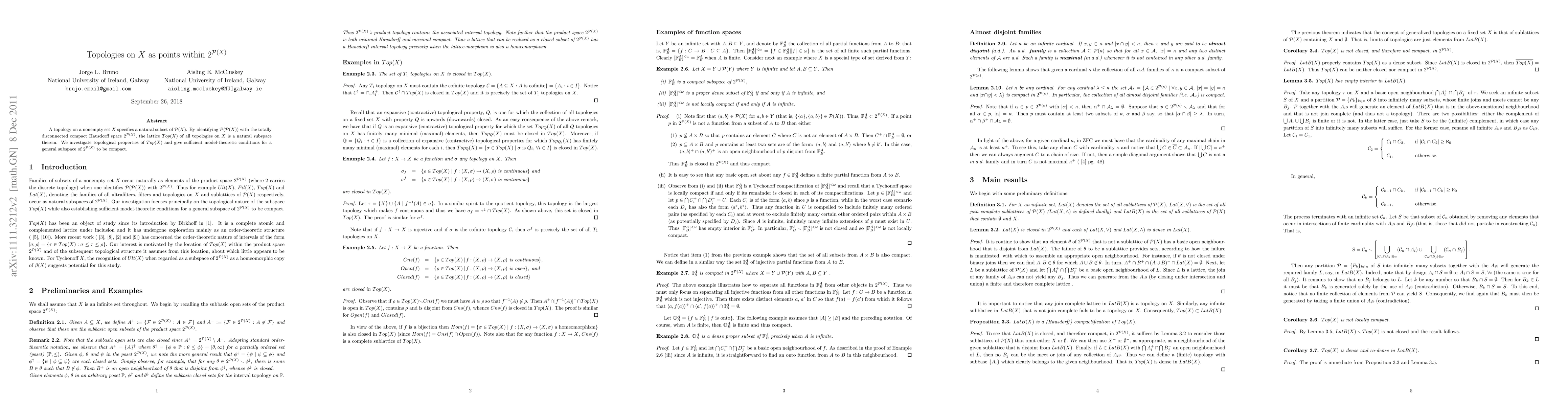 A topology on a nonempty set $X$ specifies a natural subset of $\mathcal{P}(X)$. By identifying $\mathcal{P}(\mathcal{P}(X))$ with the totally disconnected compact Hausdorff space $2^{\mathcal{P}(X)}$, the lattice $Top(X)$ of all topologies on $X$ is a natural subspace therein. We investigate topological properties of $Top(X)$ and give sufficient model-theoretic conditions for a general subspace of $2^{\mathcal{P}(X)}$ to be compact.