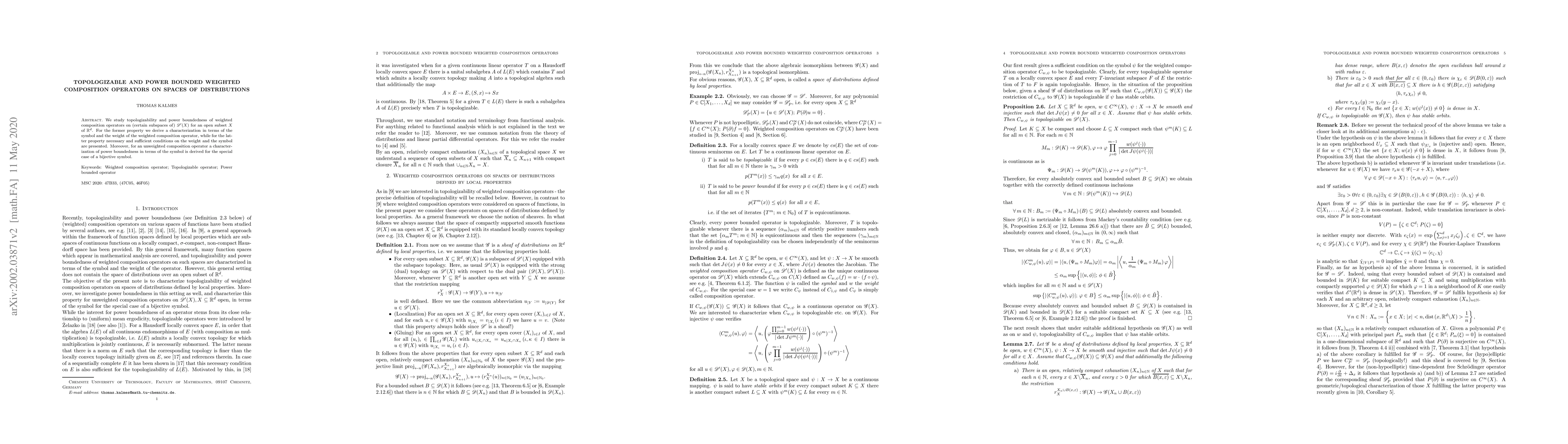 This paper investigates the topologizability and power boundedness of weighted composition operators on distributions. It provides a characterization of topologizability based on the operator's symbol and weight, and presents necessary and sufficient conditions for power boundedness. For unweighted composition operators with bijective symbols, a specific characterization of power boundedness is also derived.