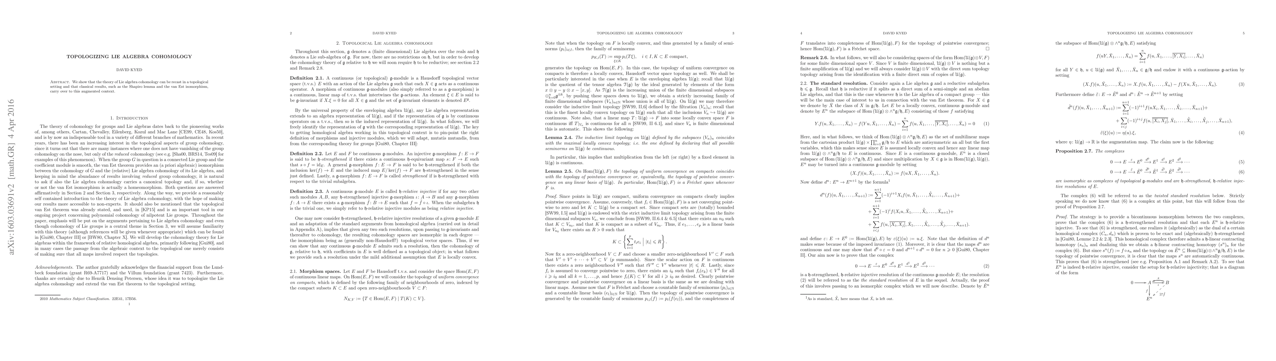We show that the theory of Lie algebra cohomology can be recast in a topological setting and that classical results, such as the Shapiro lemma and the van Est isomorphism, carry over to this augmented context.