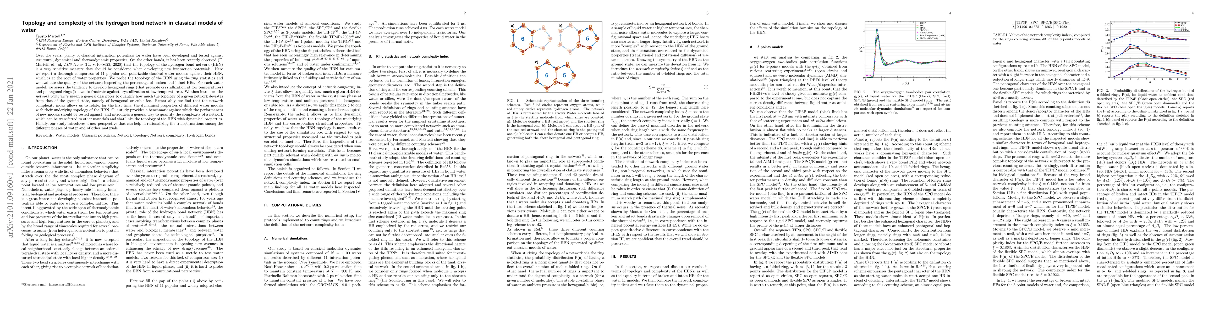 Over the years, plenty of classical interaction potentials for water have been developed and tested against structural, dynamical and thermodynamic properties. On the other hands, it has been recently observed (F. Martelli et. al, \textit{ACS Nano}, \textbf{14}, 8616--8623, 2020) that the topology of the hydrogen bond network (HBN) is a very sensitive measure that should be considered when developing new interaction potentials. Here we report a thorough comparison of 11 popular non polarizable classical water models against their HBN, which is at the root of water properties. We probe the topology of the HBN using the ring statistics and we evaluate the quality of the network inspecting the percentage of broken and intact HBs. For each water model, we assess the tendency to develop hexagonal rings (that promote crystallization at low temperatures) and pentagonal rings (known to frustrate against crystallization at low temperatures). We then introduce the \emph{network complexity index}, a general descriptor to quantify how much the topology of a given network deviates from that of the ground state, namely of hexagonal or cubic ice. Remarkably, we find that the network complexity index allows us to relate, for the first time, the dynamical properties of different water models with their underlying topology of the HBN. Our study provides a benchmark against which the performances of new models should be tested against, and introduces a general way to quantify the complexity of a network which can be transferred to other materials and that links the topology of the HBN with dynamical properties. Finally, our study introduces a new perspective that can help in rationalizing the transformations among the different phases of water and of other materials.