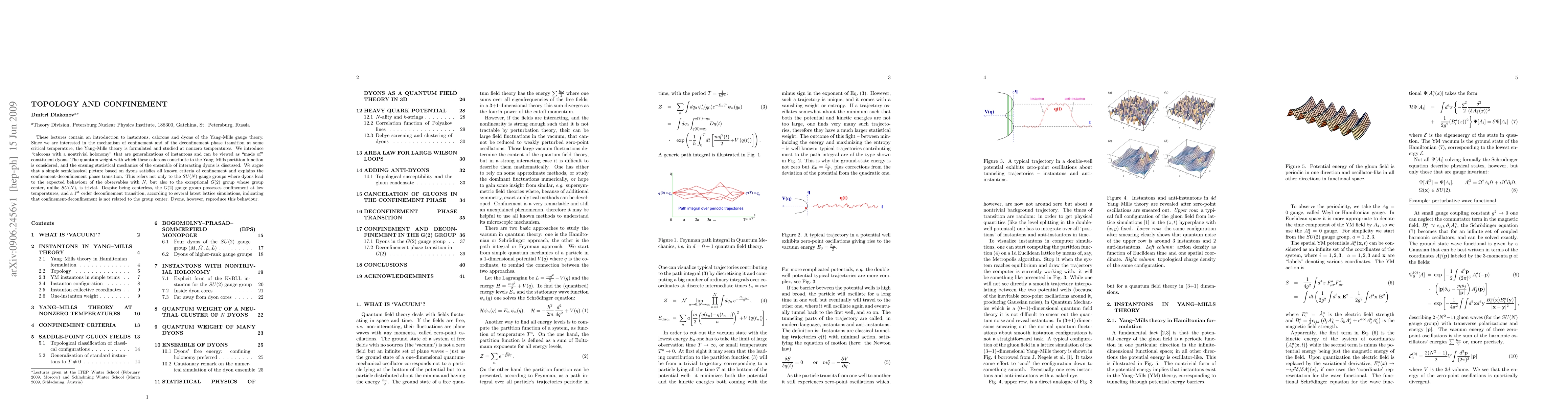 These lectures contain an introduction to instantons, calorons and dyons of the Yang--Mills gauge theory. Since we are interested in the mechanism of confinement and of the deconfinement phase transition at some critical temperature, the Yang--Mills theory is formulated and studied at nonzero temperatures. We introduce ``calorons with a nontrivial holonomy'' that are generalizations of instantons and can be viewed as ``made of'' constituent dyons. The quantum weight with which these calorons contribute to the Yang--Mills partition function is considered, and the ensuing statistical mechanics of the ensemble of interacting dyons is discussed. We argue that a simple semiclassical picture based on dyons satisfies all known criteria of confinement and explains the confinement-deconfinement phase transition. This refers not only to the SU(N) gauge groups where dyons lead to the expected behaviour of the observables with N, but also to the exceptional G(2) group whose group center, unlike SU(N), is trivial. Despite being centerless, the G(2) gauge group possesses confinement at low temperatures, and a 1st order deconfinement transition, according to several latest lattice simulations, indicating that confinement-deconfinement is not related to the group center. Dyons, however, reproduce this behaviour.