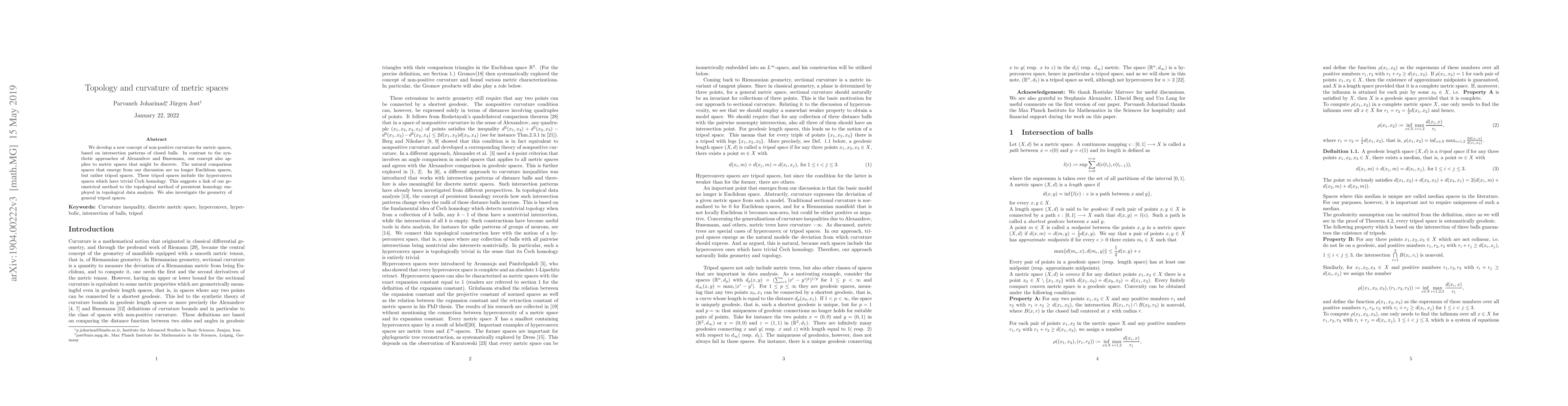 We develop a new concept of non-positive curvature for metric spaces, based on intersection patterns of closed balls. In contrast to the synthetic approaches of Alexandrov and Buesemann, our concept also applies to metric spaces that might be discrete. The natural comparison spaces that emerge from our discussion are no longer Euclidean spaces, but rather tripod spaces. These tripod spaces include the hyperconvex spaces which have trivial Cech homology. This suggests a link of our geometrical method to the topological method of persistent homology in topological data analysis. We also investigate the geometry of general tripod spaces.