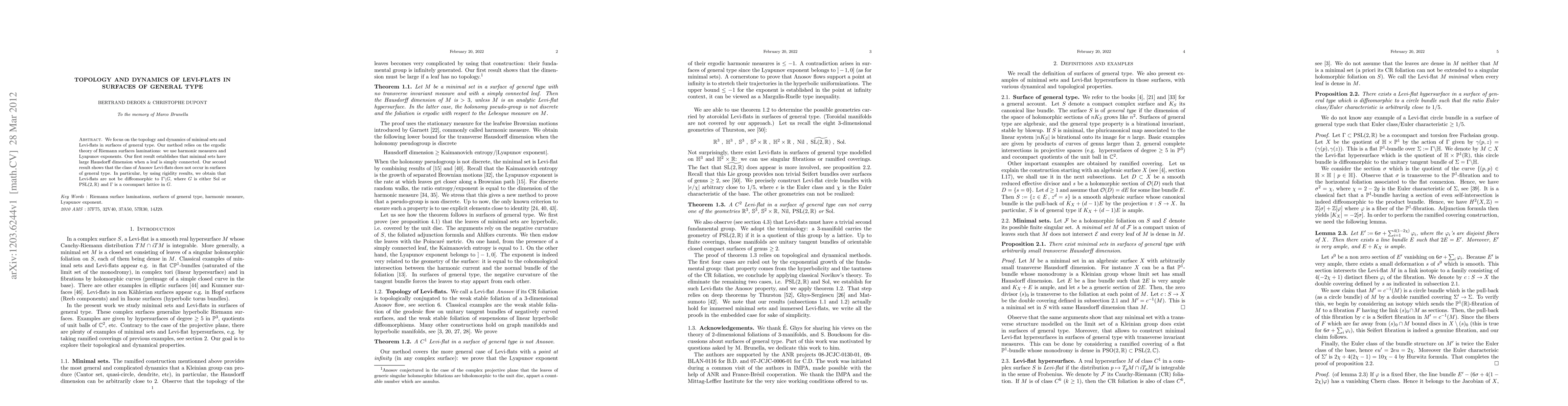 This paper examines the topology and dynamics of Levi-flats in surfaces of general type using ergodic theory, showing that minimal sets exhibit large Hausdorff dimension when leaves are simply connected. It also proves that Anosov Levi-flats do not exist in such surfaces, establishing rigidity results against their equivalence to certain hyperbolic structures.