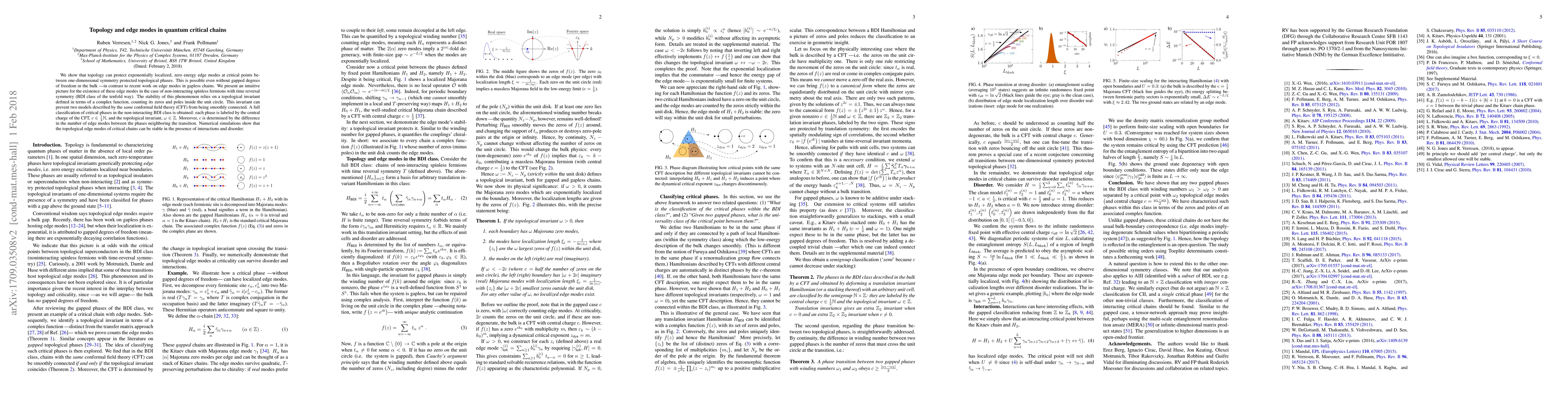 We show that topology can protect exponentially localized, zero energy edge modes at critical points between one-dimensional symmetry protected topological phases. This is possible even without gapped degrees of freedom in the bulk ---in contrast to recent work on edge modes in gapless chains. We present an intuitive picture for the existence of these edge modes in the case of non-interacting spinless fermions with time reversal symmetry (BDI class of the tenfold way). The stability of this phenomenon relies on a topological invariant defined in terms of a complex function, counting its zeros and poles inside the unit circle. This invariant can prevent two models described by the \emph{same} conformal field theory (CFT) from being smoothly connected. A full classification of critical phases in the non-interacting BDI class is obtained: each phase is labeled by the central charge of the CFT, $c \in \frac{1}{2}\mathbb N$, and the topological invariant, $\omega \in \mathbb Z$. Moreover, $c$ is determined by the difference in the number of edge modes between the phases neighboring the transition. Numerical simulations show that the topological edge modes of critical chains can be stable in the presence of interactions and disorder.