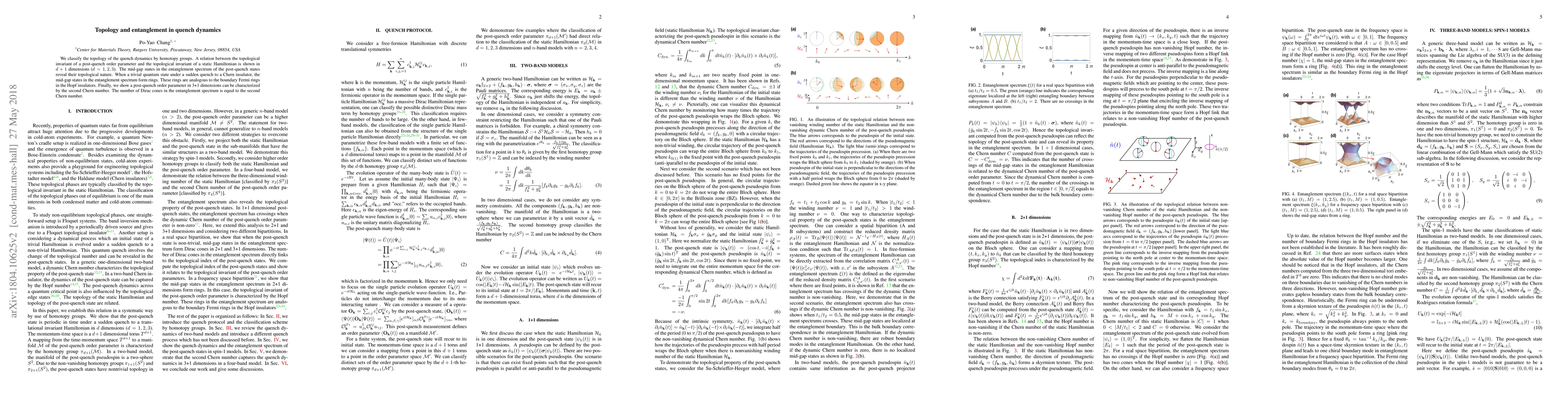 This paper explores the topological aspects of quantum quench dynamics, demonstrating a connection between the topological invariants of post-quench order parameters and static Hamiltonians across dimensions. It reveals mid-gap states in the entanglement spectrum that characterize the topological nature of post-quench states, with rings analogous to boundary Fermi rings in Hopf insulators, and the second Chern number in 3+1 dimensions.