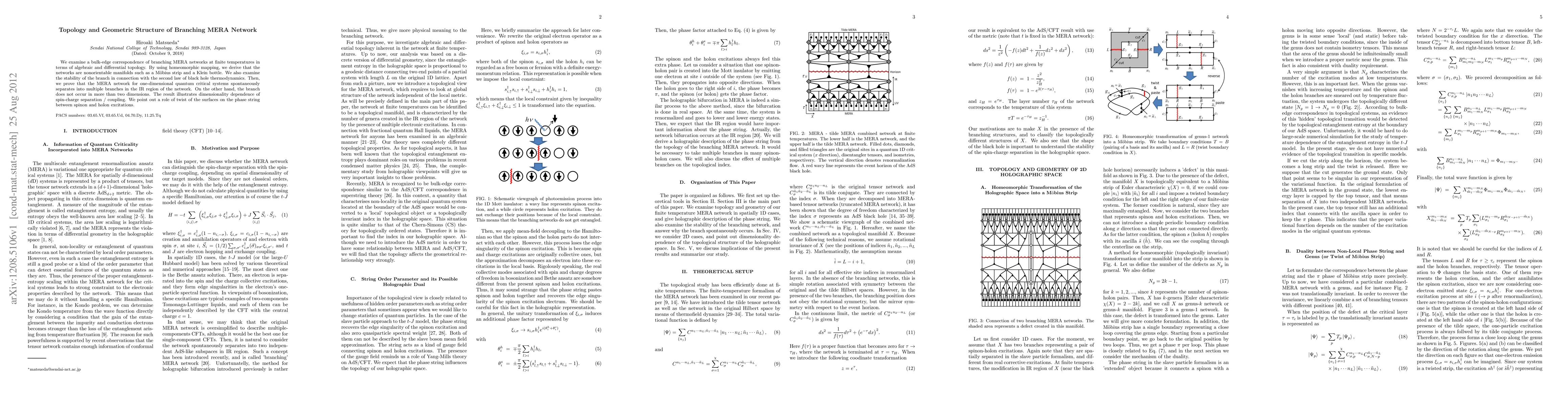 We examine a bulk-edge correspondence of branching MERA networks at finite temperatures in terms of algebraic and differential topology. By using homeomorphic mapping, we derive that the networks are nonorientable manifolds such as a M$\ddot{\rm o}$bius strip and a Klein bottle. We also examine the stability of the branch in connection with the second law of black hole thermodynamics. Then, we prove that the MERA network for one-dimensional quantum critical systems spontaneously separates into multiple branches in the IR region of the network. On the other hand, the branch does not occur in more than two dimensions. The result illustrates dimensionality dependence of spin-charge separation / coupling. We point out a role of twist of the surfaces on the phase string between spinon and holon excitations.